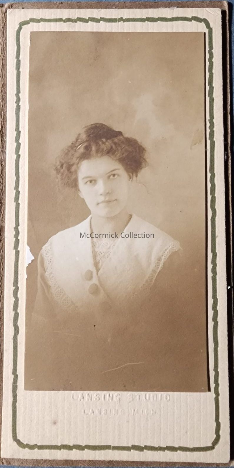 Photograph of an unidentified woman by the Lansing Studio, circa 1910s. In a brown folder/frame mounting. Studio blind stamp.