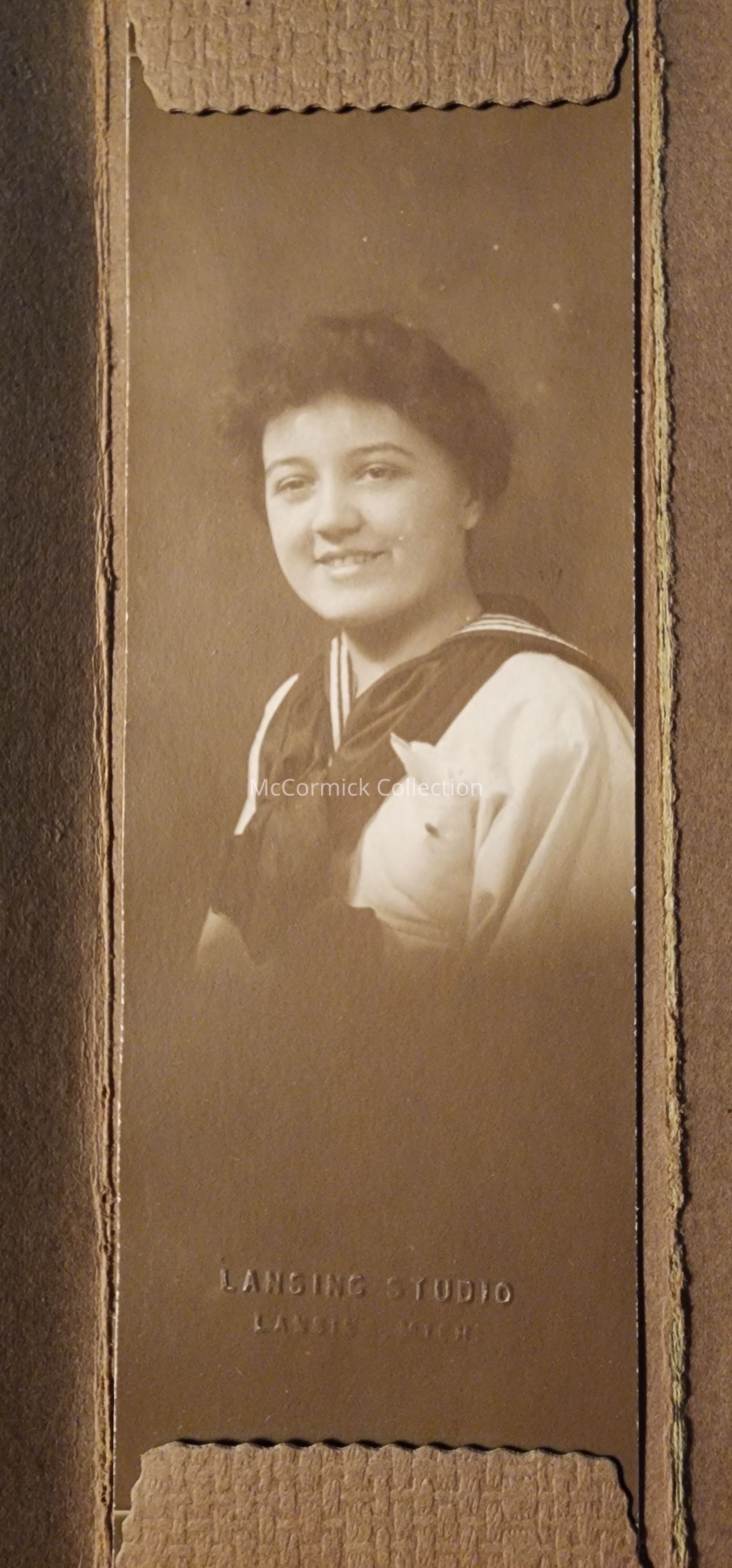 Folder frame mounted photograph of an unidentified woman by Lansing photographer the Lansing Studio.