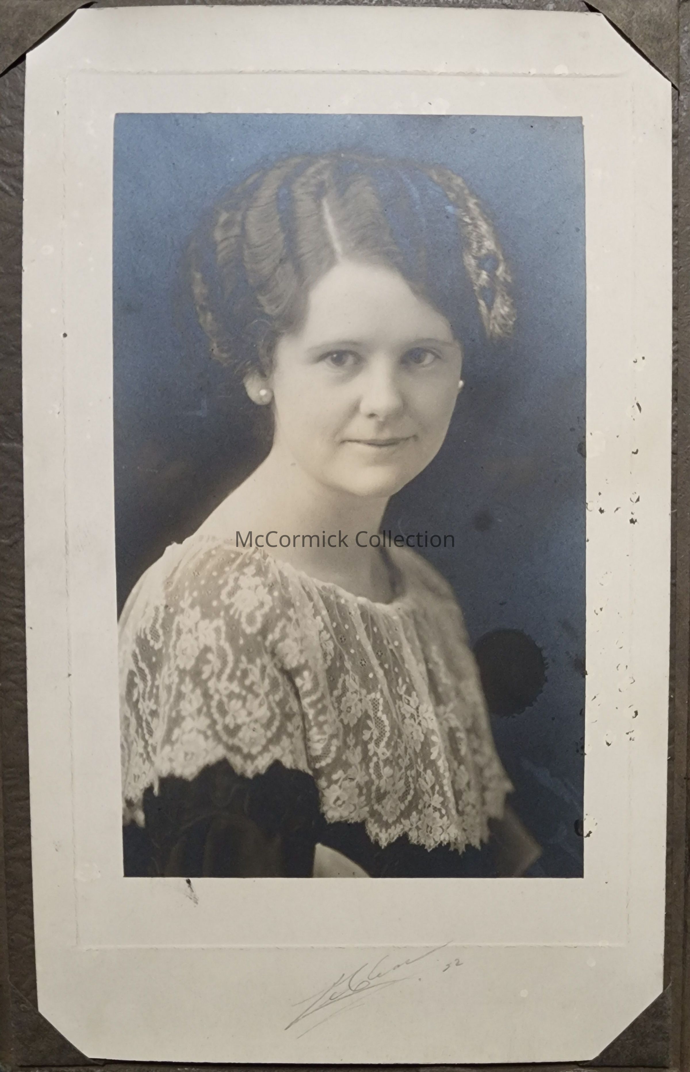 Folder frame mounted photograph of an unidentified woman by Lansing photographer LeClear. Dated 1922.