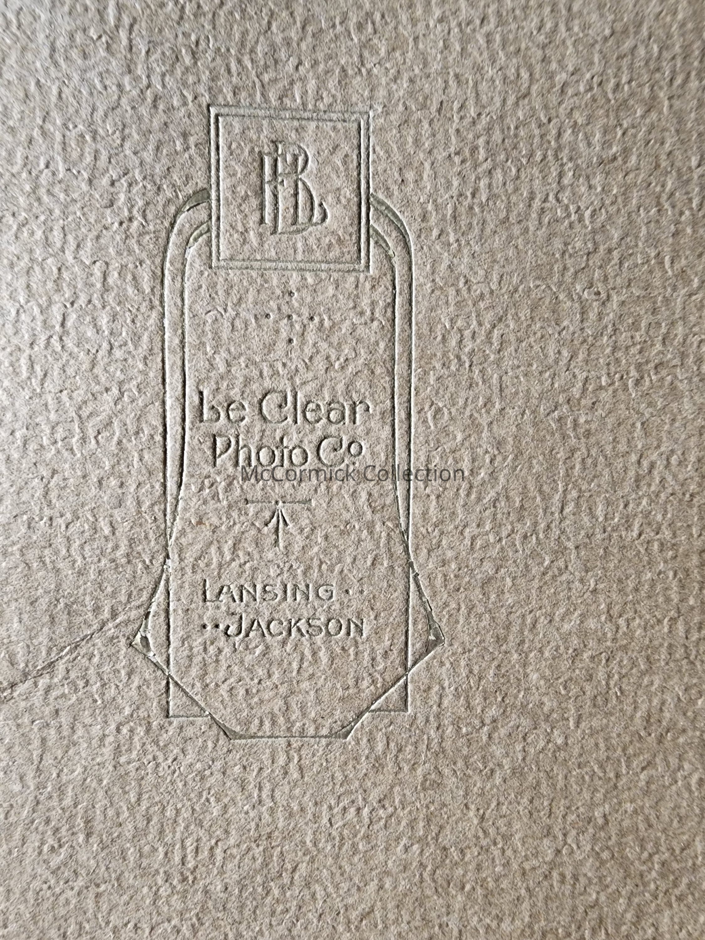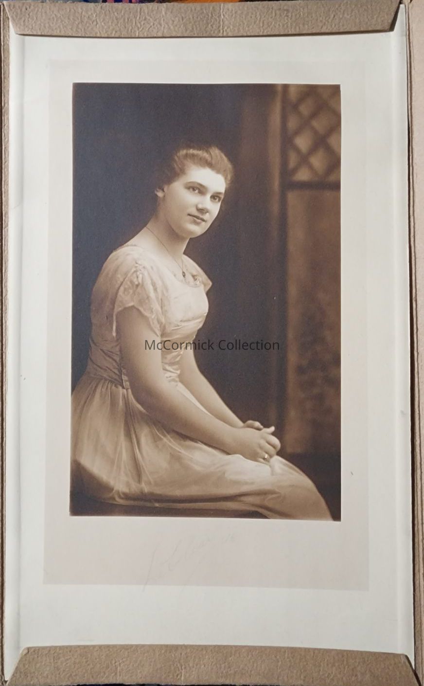 A portrait photograph of an unidentified woman by Lansing photographer LeClear, dated 1916. Mounted in a brown folder/frame. From Siebert Estate.