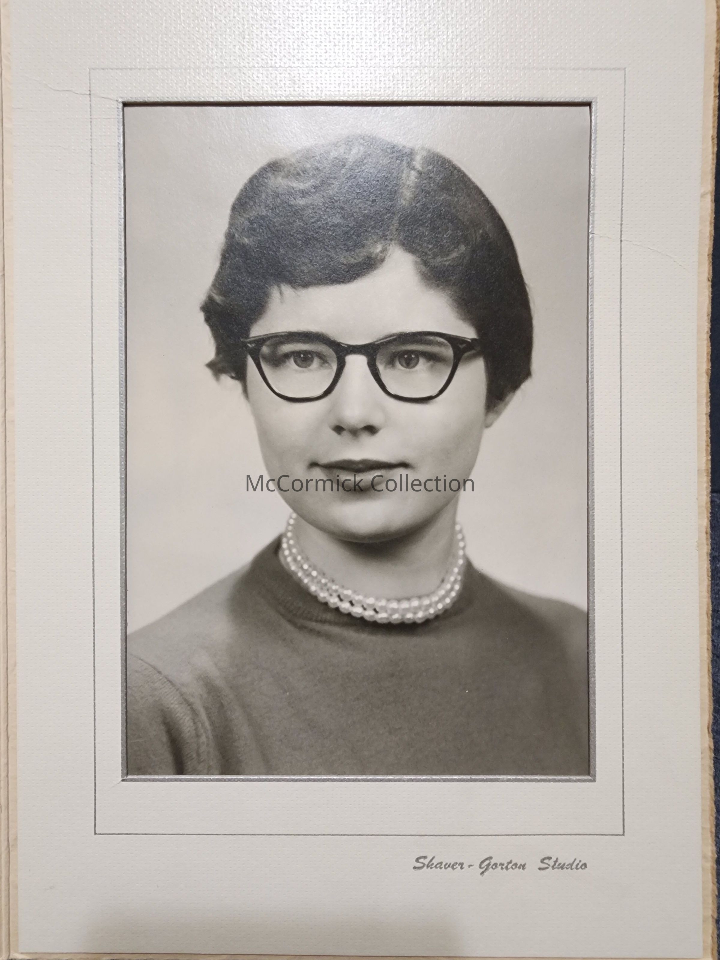 Folder frame mounted photograph of an unidentified woman by Lansing photographer Shaver Gorton Studio.