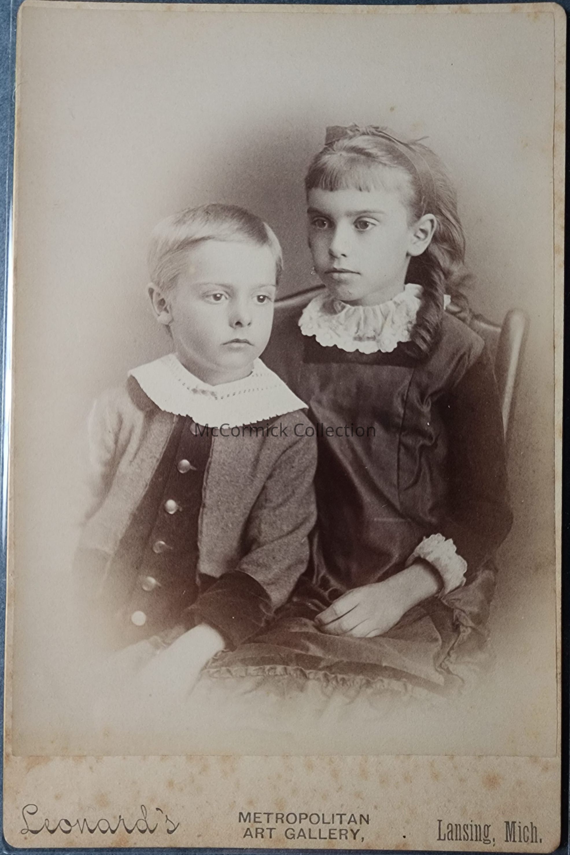 Cabinet card photograph of unidentified children by Lansing photographer Leonard's Metropolitan Art Gallery.Made/Created