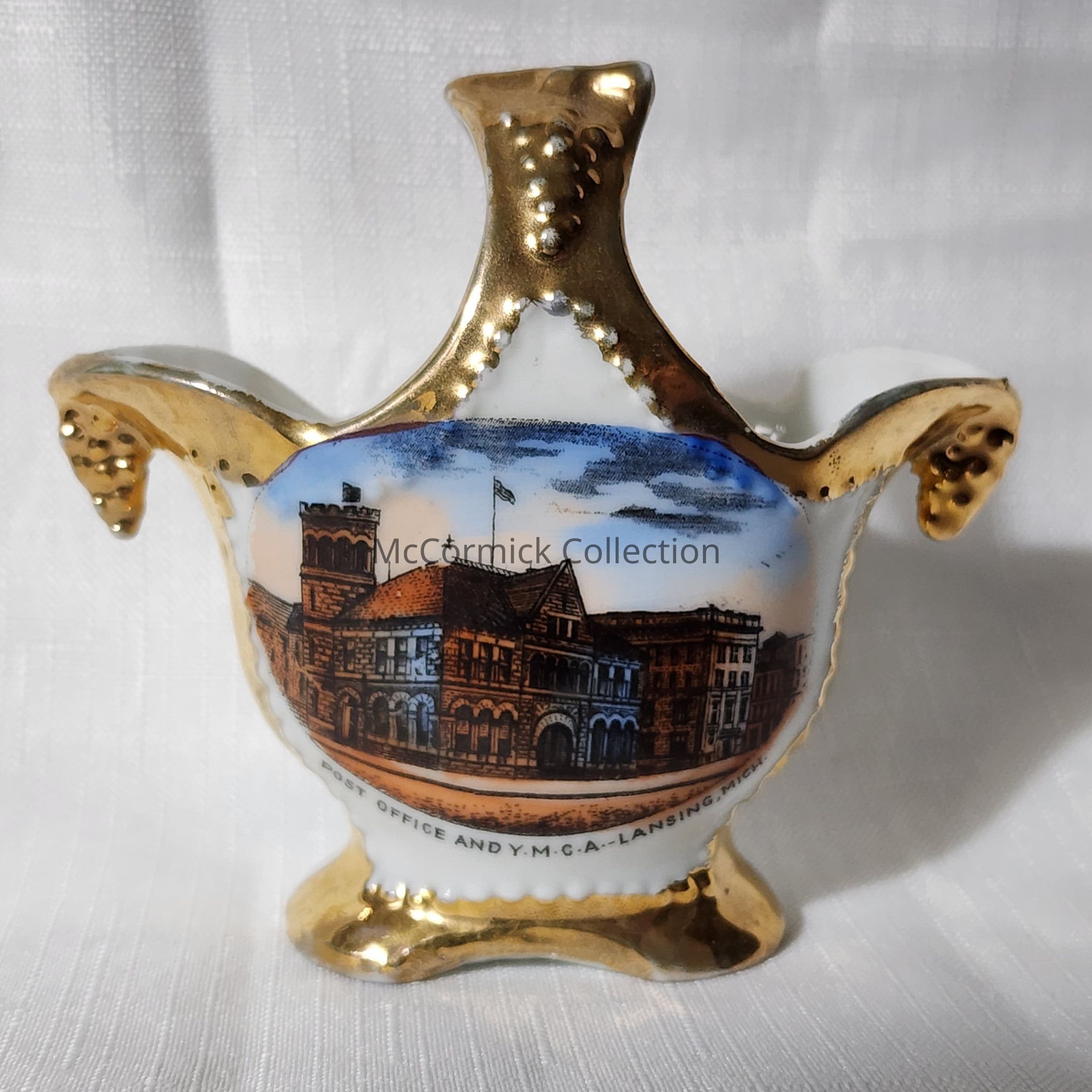 Porcelain souvenir basket shaped piece of the Lansing postoffice and YMCA buildings.