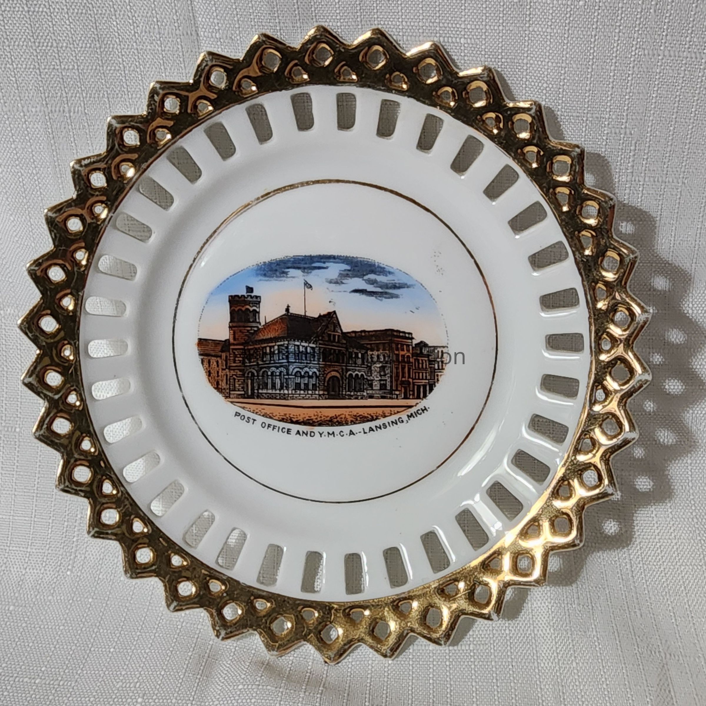 Porcelain souvenir reticulated rubbin plate of the Lansing Post Office and YMCA buildings.