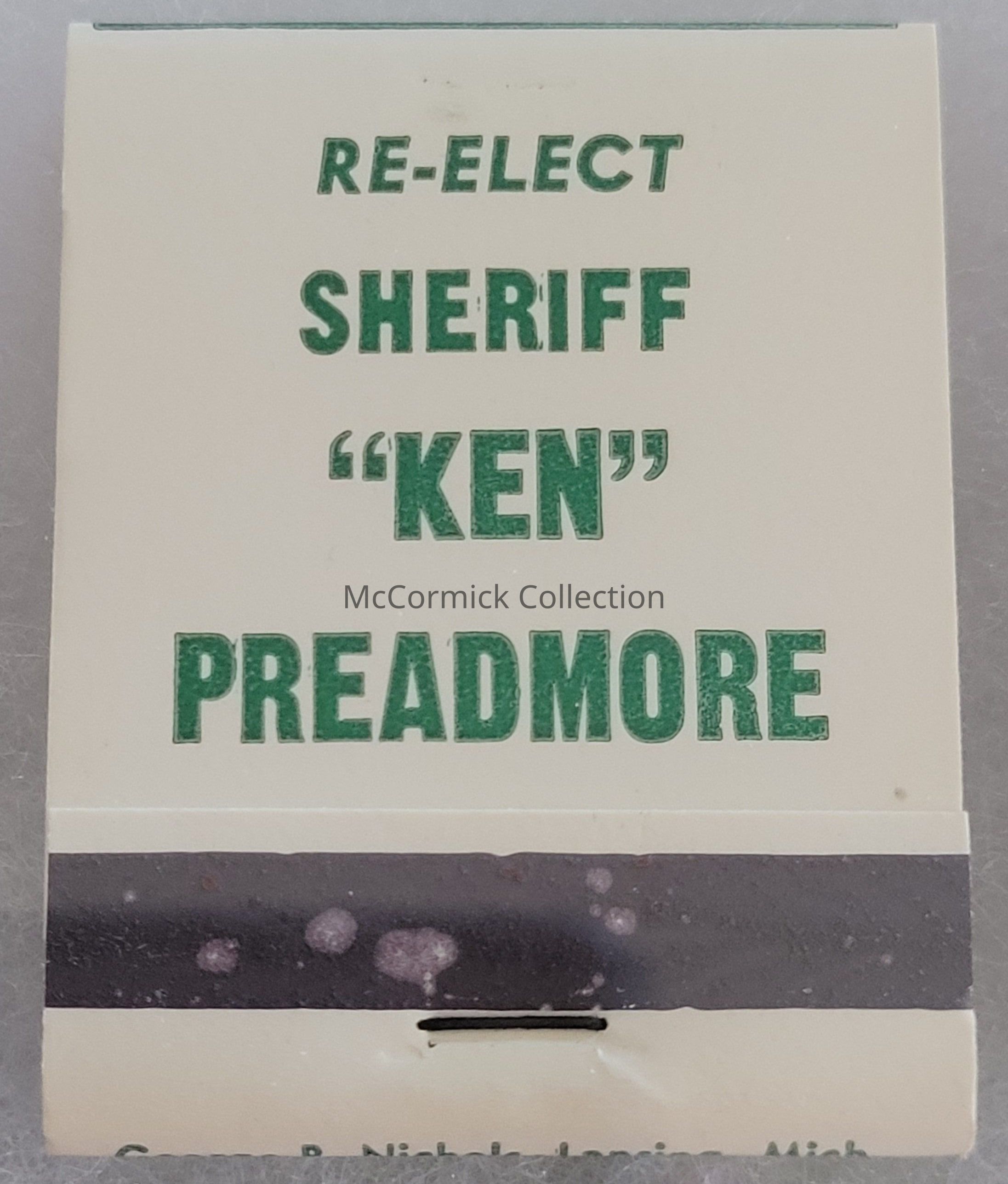 A box of new old stock green and white reelection campaign matchbooks (full) for Kenneth Preadmore for Ingham County Sheriff, circa 1970s. From the Preadmore Estate.