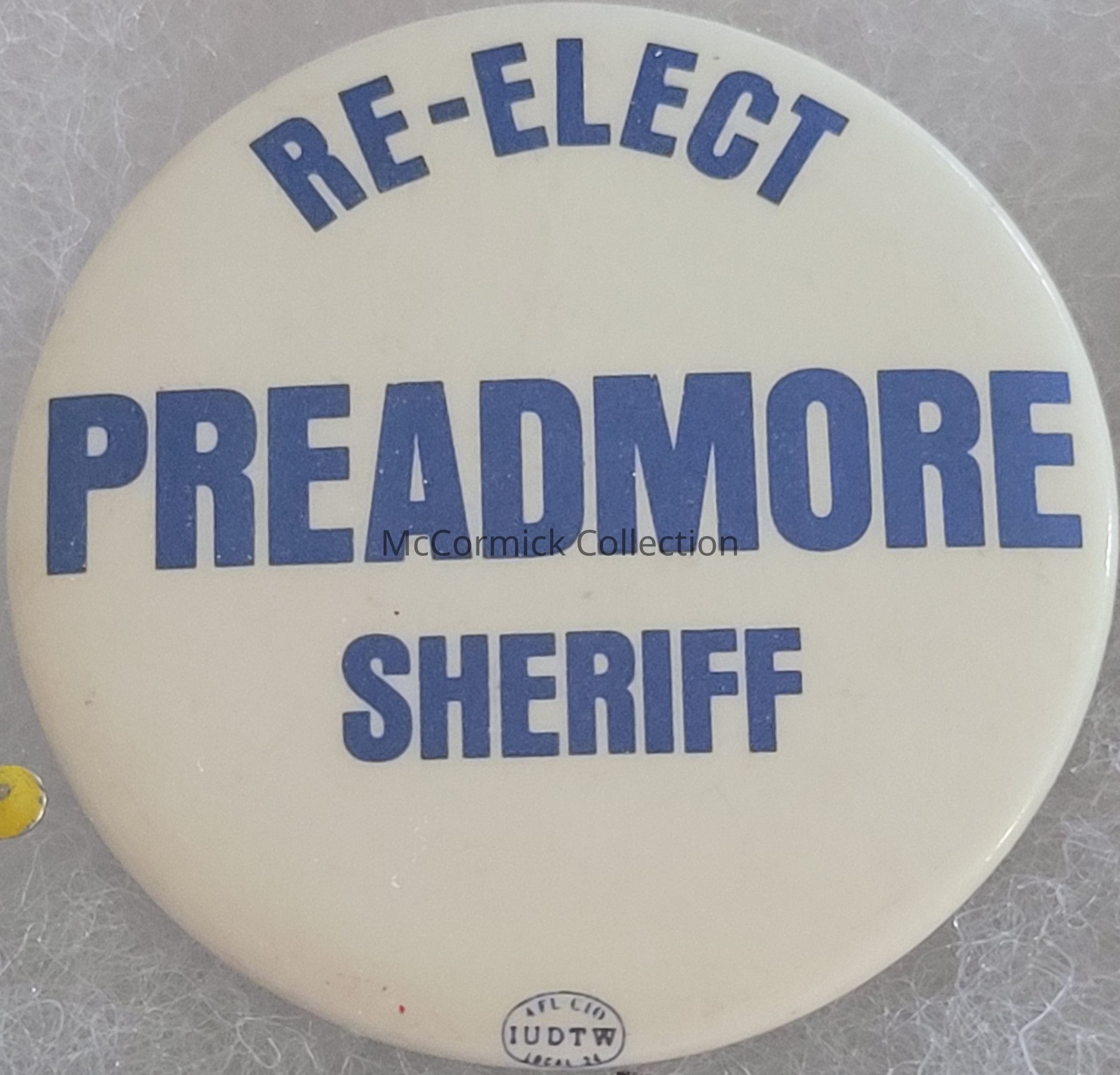 A 1.5" blue and white political button for the reelection of Kenneth Preadmore as Ingham County Sheriff, circa 1970s.