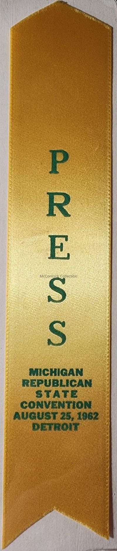 Yellow and green Press pass ribbon from thr August 25, 1962, Detroit Michigan Republican State Convention.
