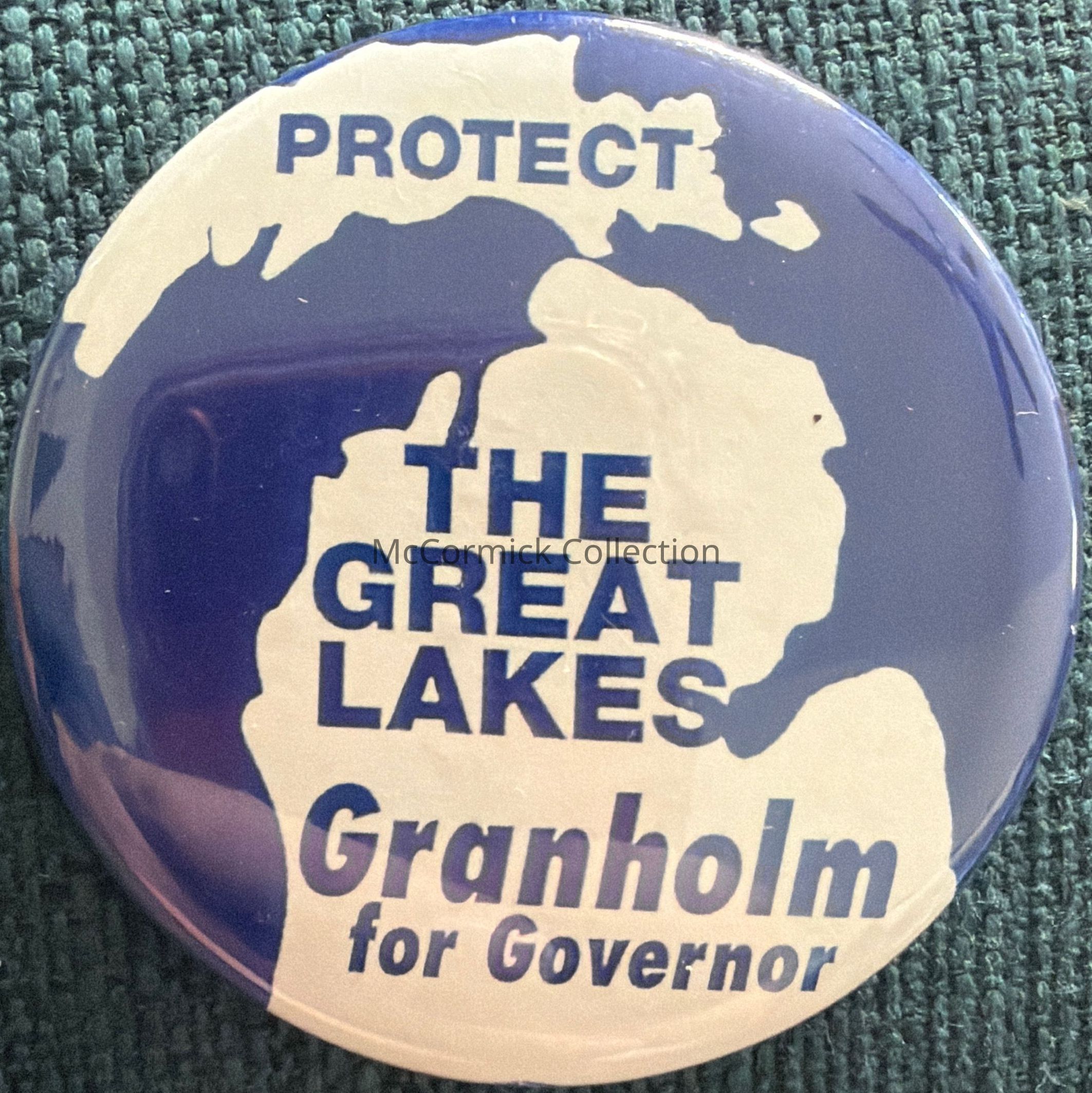 A 2.25” blue and white political button for Jennifer Granholm for Governor of Michigan.