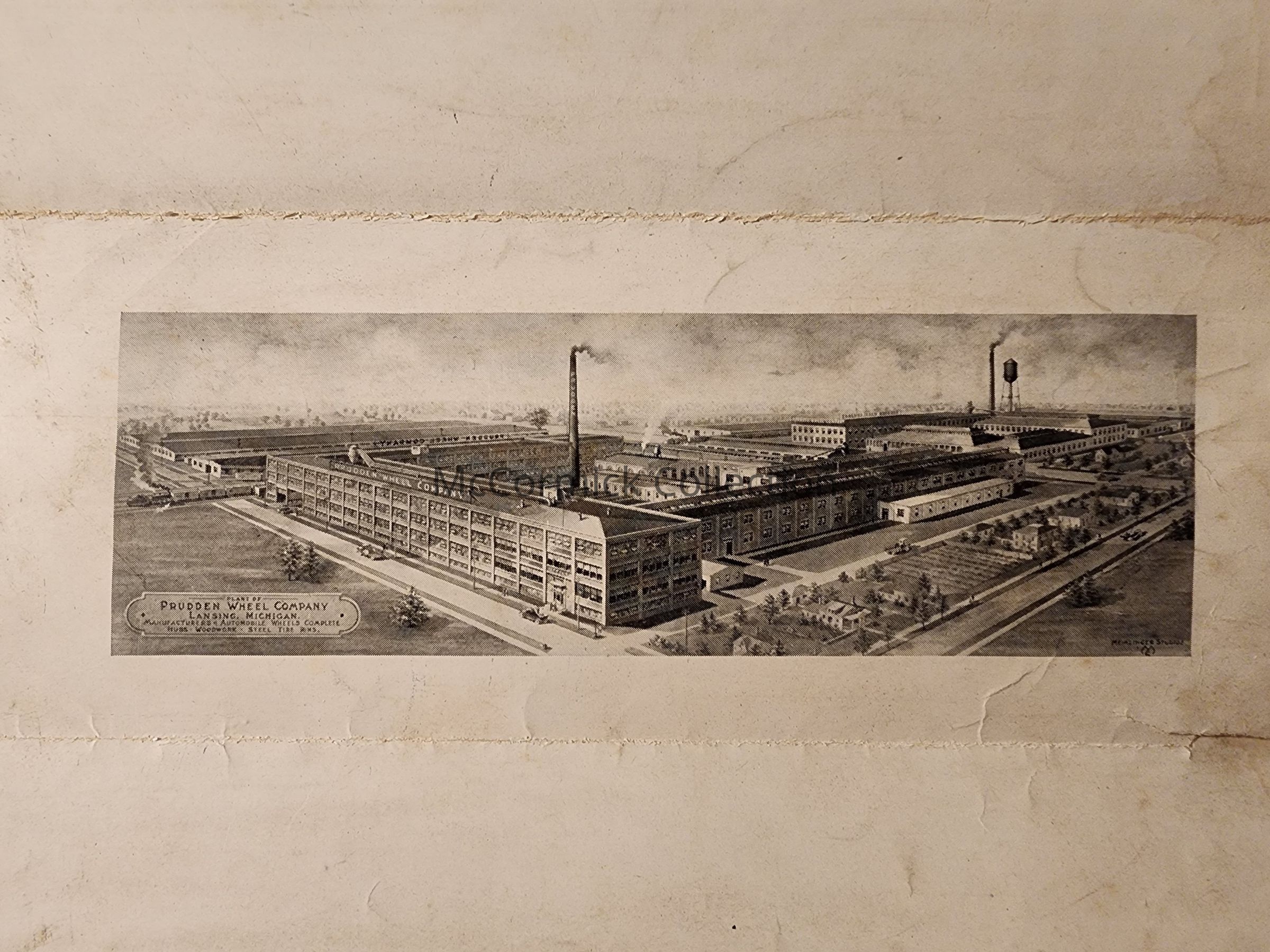 Small folding panoramic print of the Prudden Wheel Company in Lansing. Belonged to the family of Fred Gibbs.