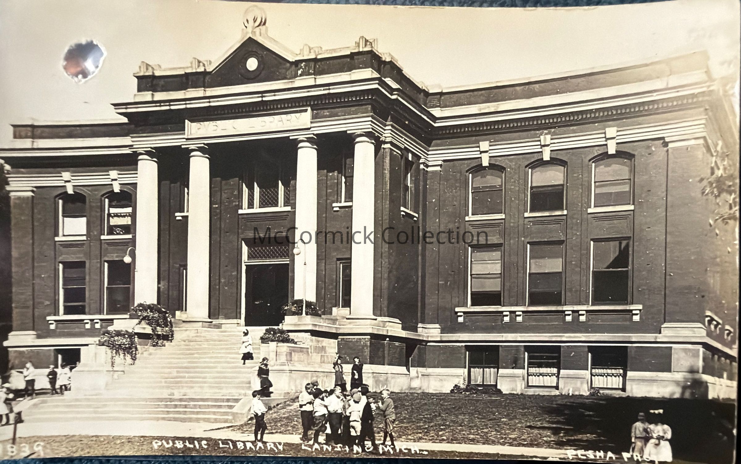 Real photo postcard of the Lansing Public Library, Carnegie Library, by photographer Pesha. Postally unused. Removed from Pesha salesman sample, hole from brad.