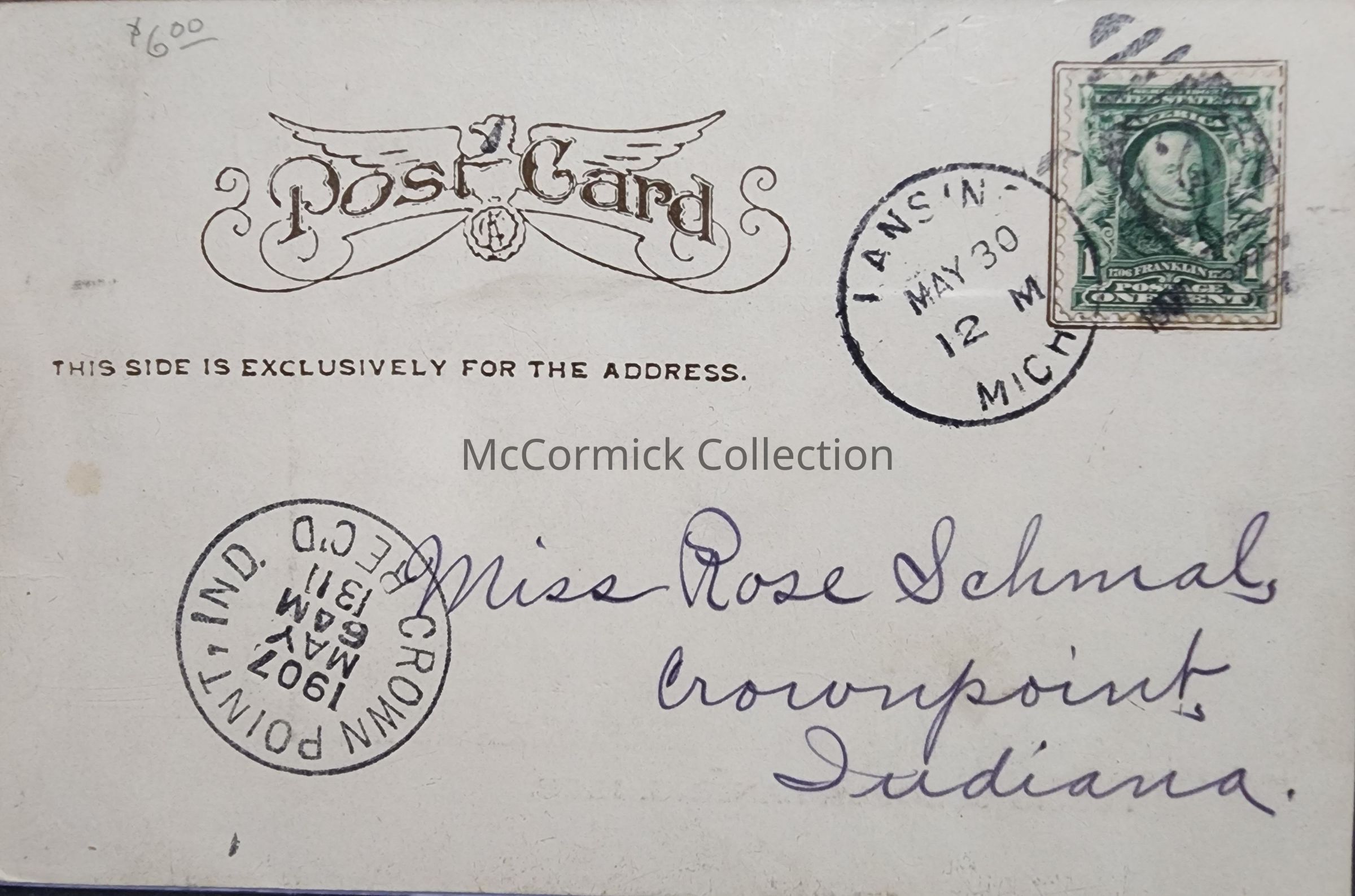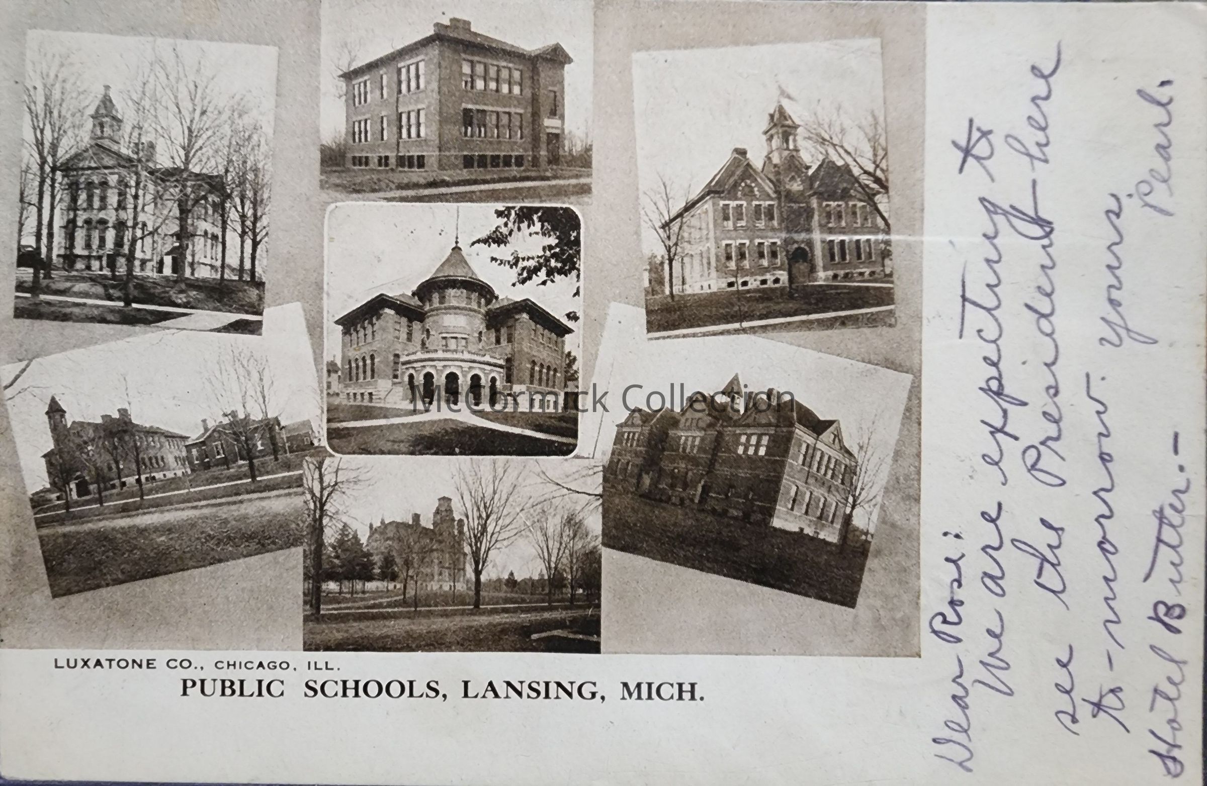 Postcard composite of the Public Schools of Lansing, Michigan. Postally used. Message reads "Dear Rose: We are expecting to see the President here to-morrow. Yours, Pearl. Hotel Butler." The message places this card as 1907, referring to the visit of Theodore Roosevelt in 1907.