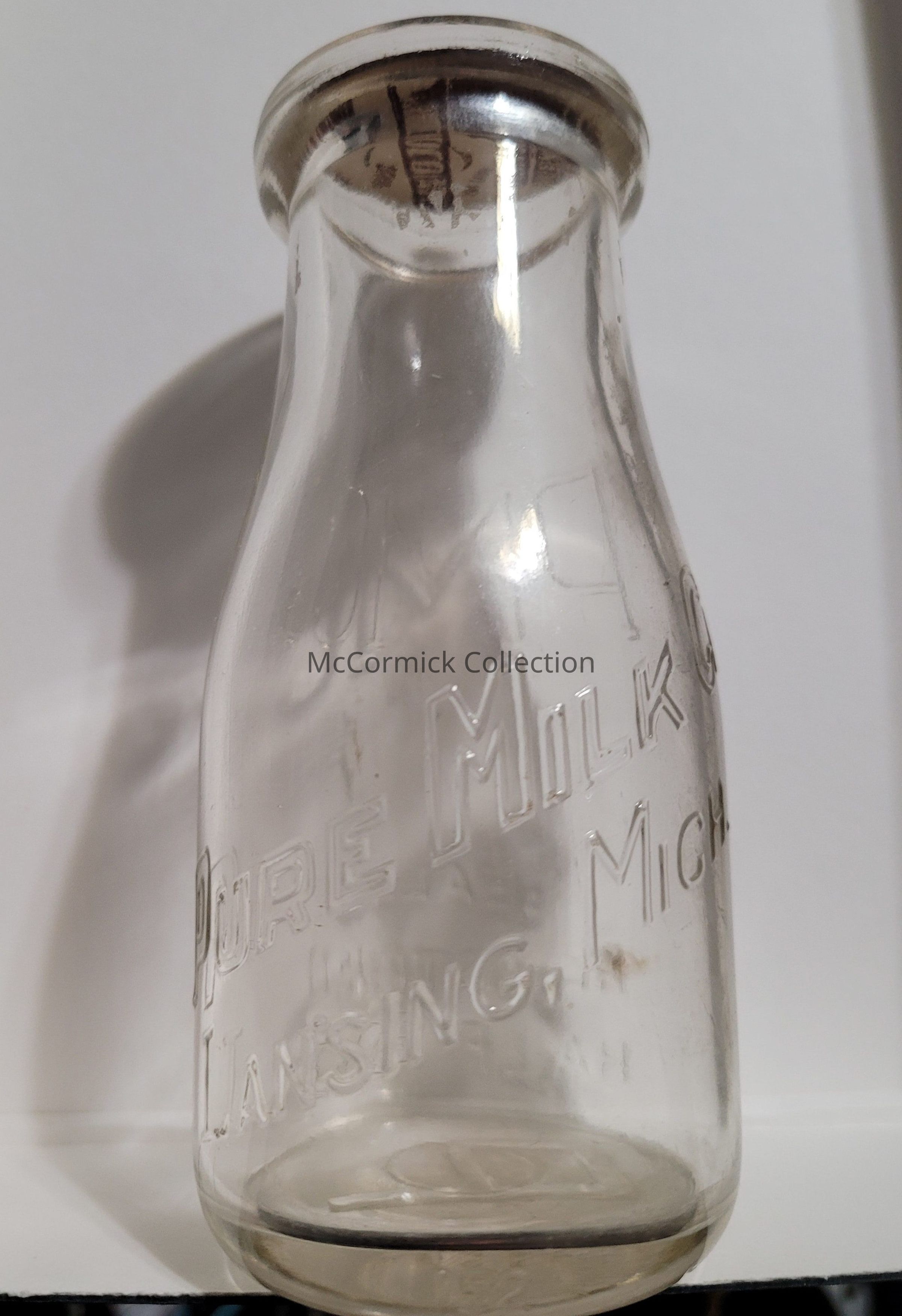 Embossed half pint botte with full block letter logo of the Pure Milk Company of Lansing.