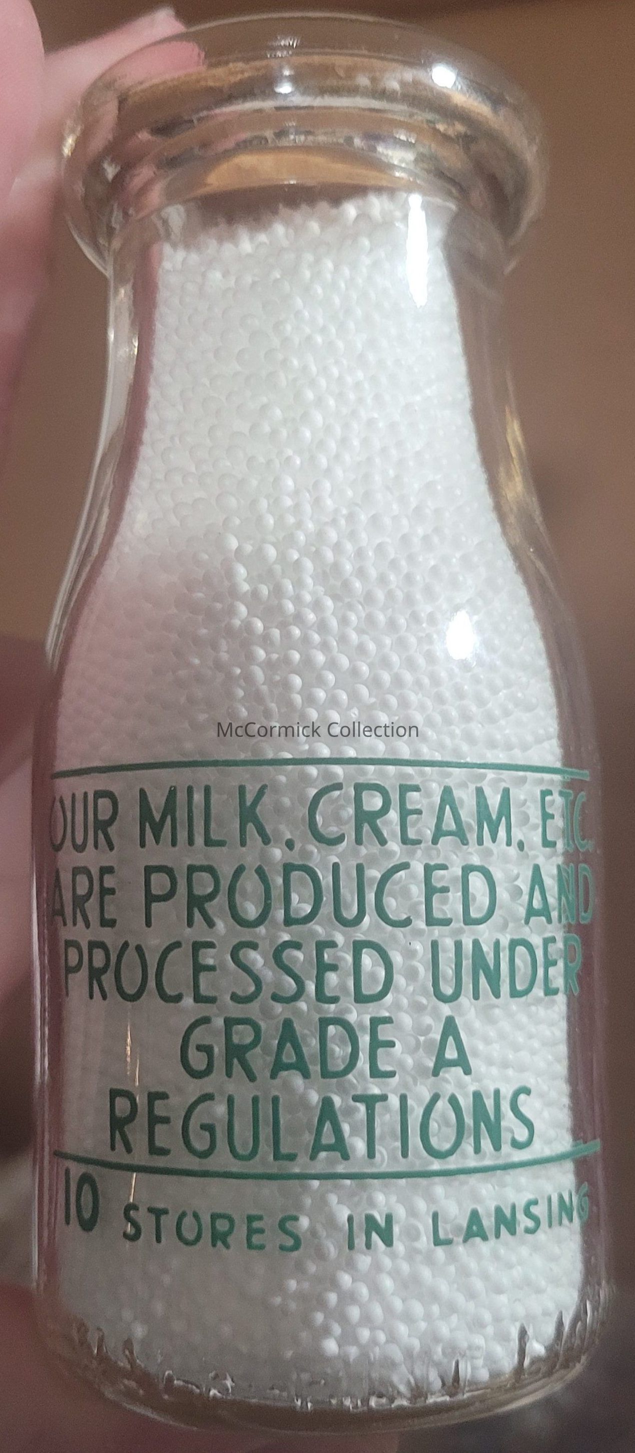 A green and red pyro half pint bottle from the Quality Dairy Co. of Lansing, with 10-store slogan on the back.