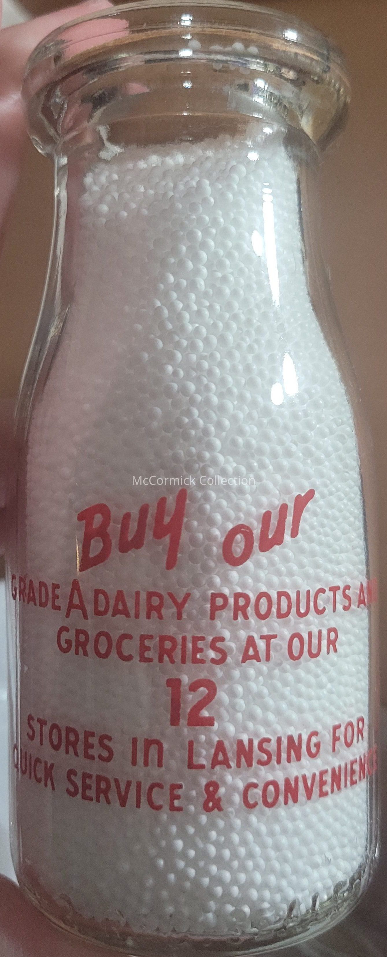 A red pyro half pint bottle from the Quality Dairy Co. of Lansing, Michigan. With 12-store slogan on the back.