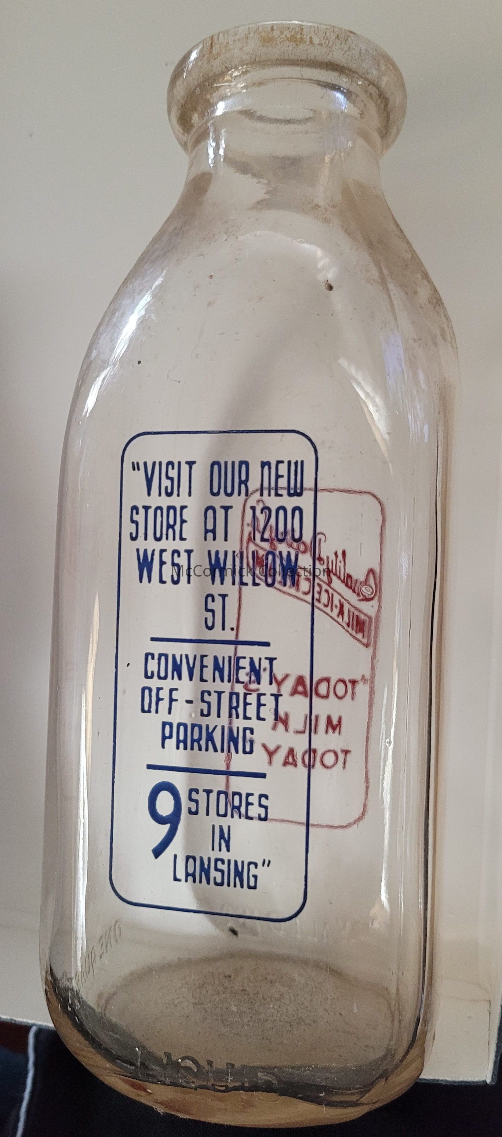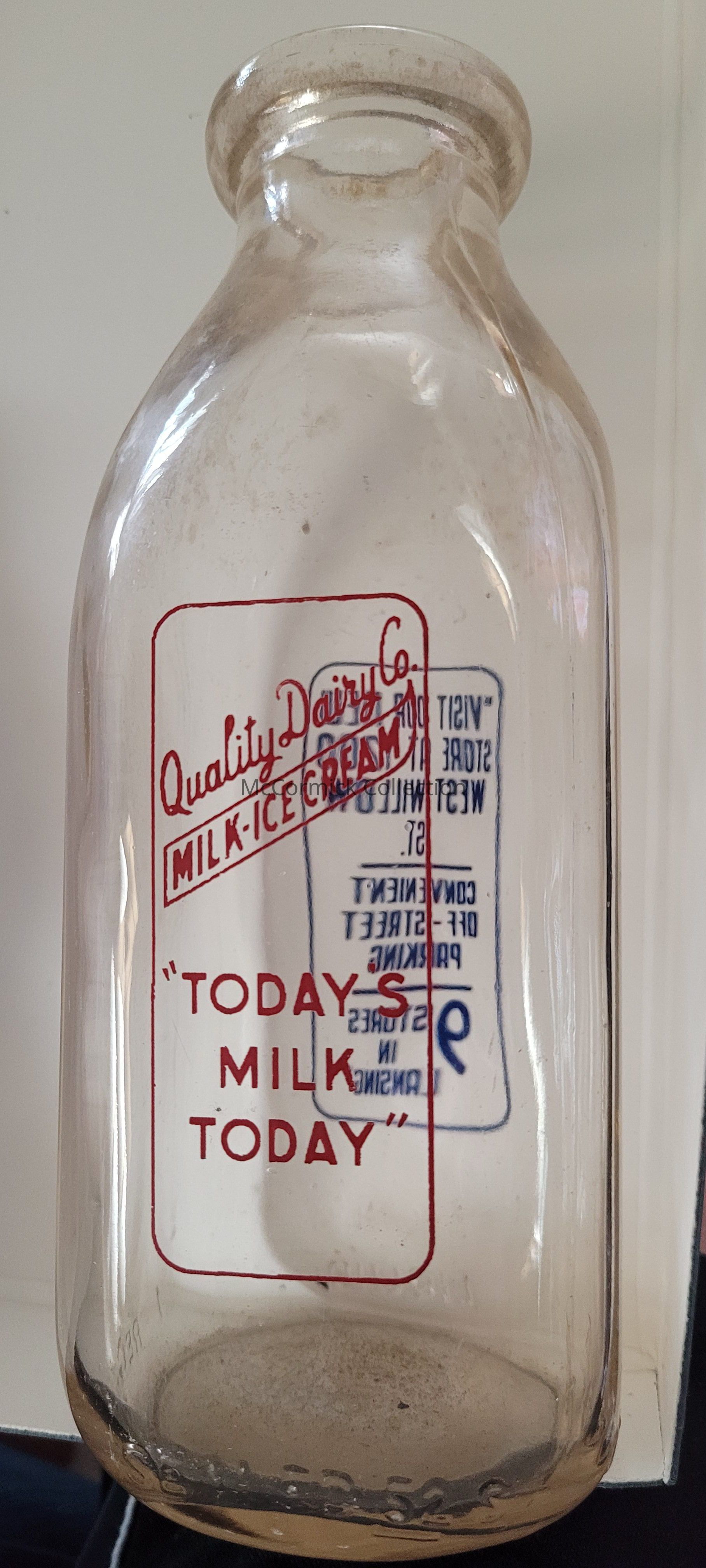 A square quart bottle with red and blue pyro from Quality Dairy Co. of Lansing, Michigan. The back slogan reads: "Visit our new store at 1200 West Willow St. / Convenient Off-Street Parking / 9 Stores in Lansing."