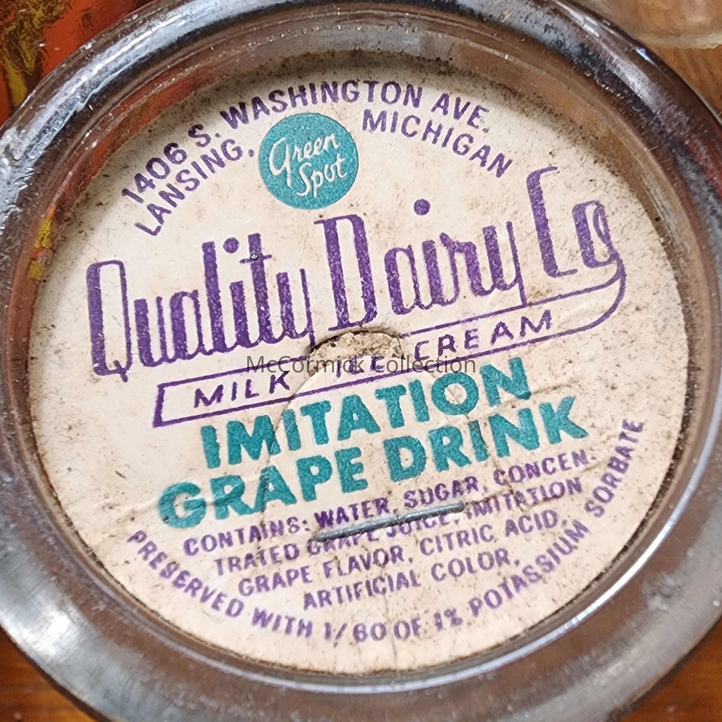Cardboard cap for the imitation grape drink from Quality Dairy Co. of Lansing.