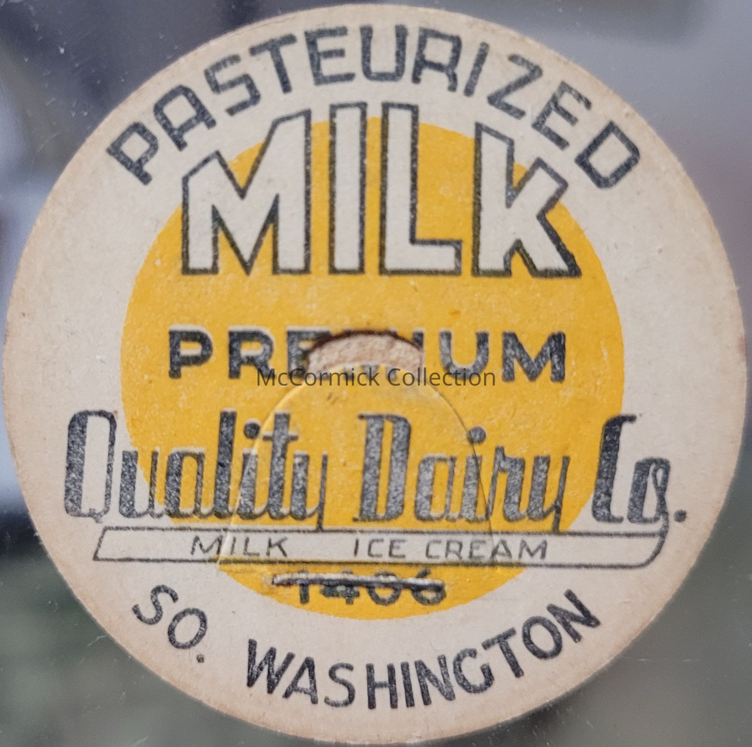A cardboard/paper cap or lid for Pasteurized Milk from Quality Dairy Co. of Lansing, Michigan.