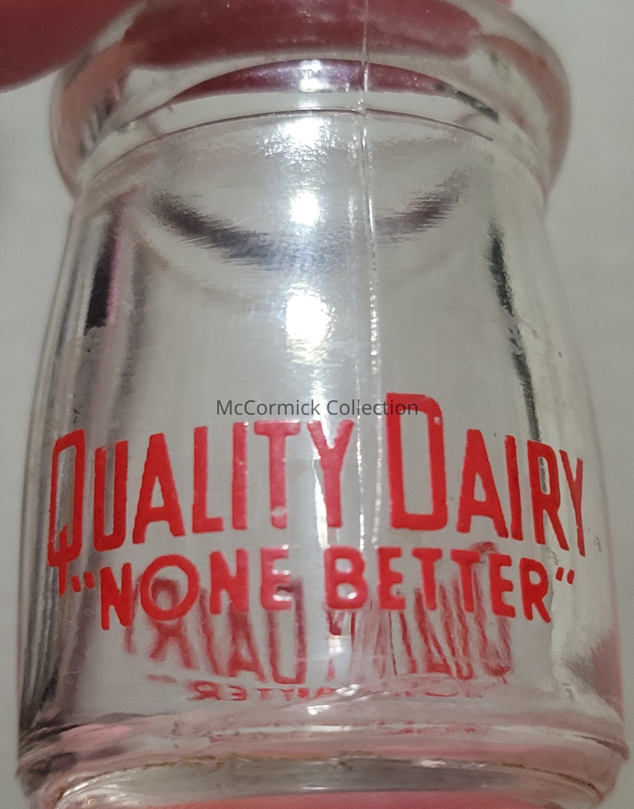 Small red pyro creamer for Quality Dairy with the "None Better" slogan.