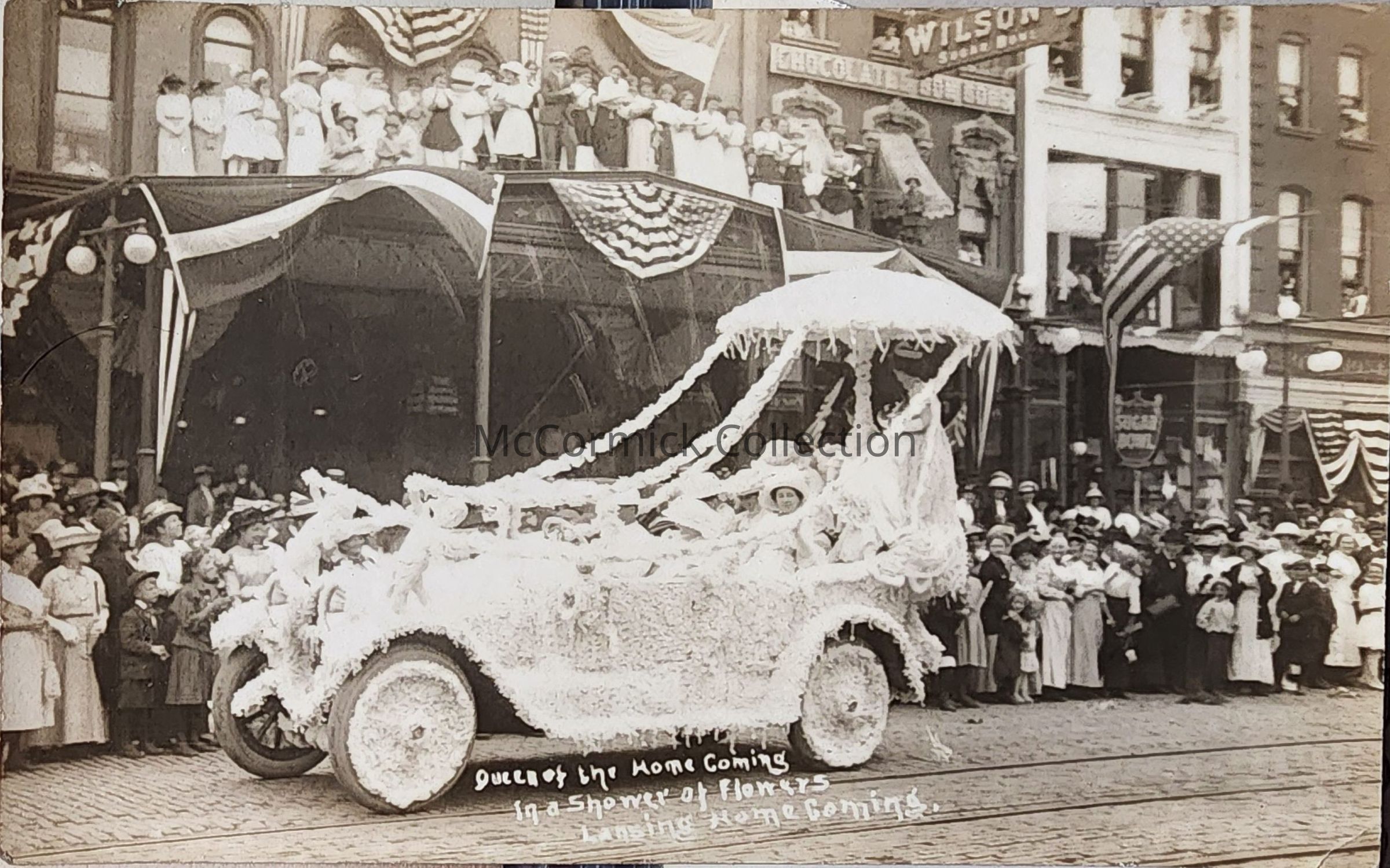 Real photo postcard of a car covered in flowers in front of Wilson's Sugar Bowl and a hotel. Captioned "Queen of the Homecoming in a Shower of Flowers, Lansing Homecoming." Postally unused.