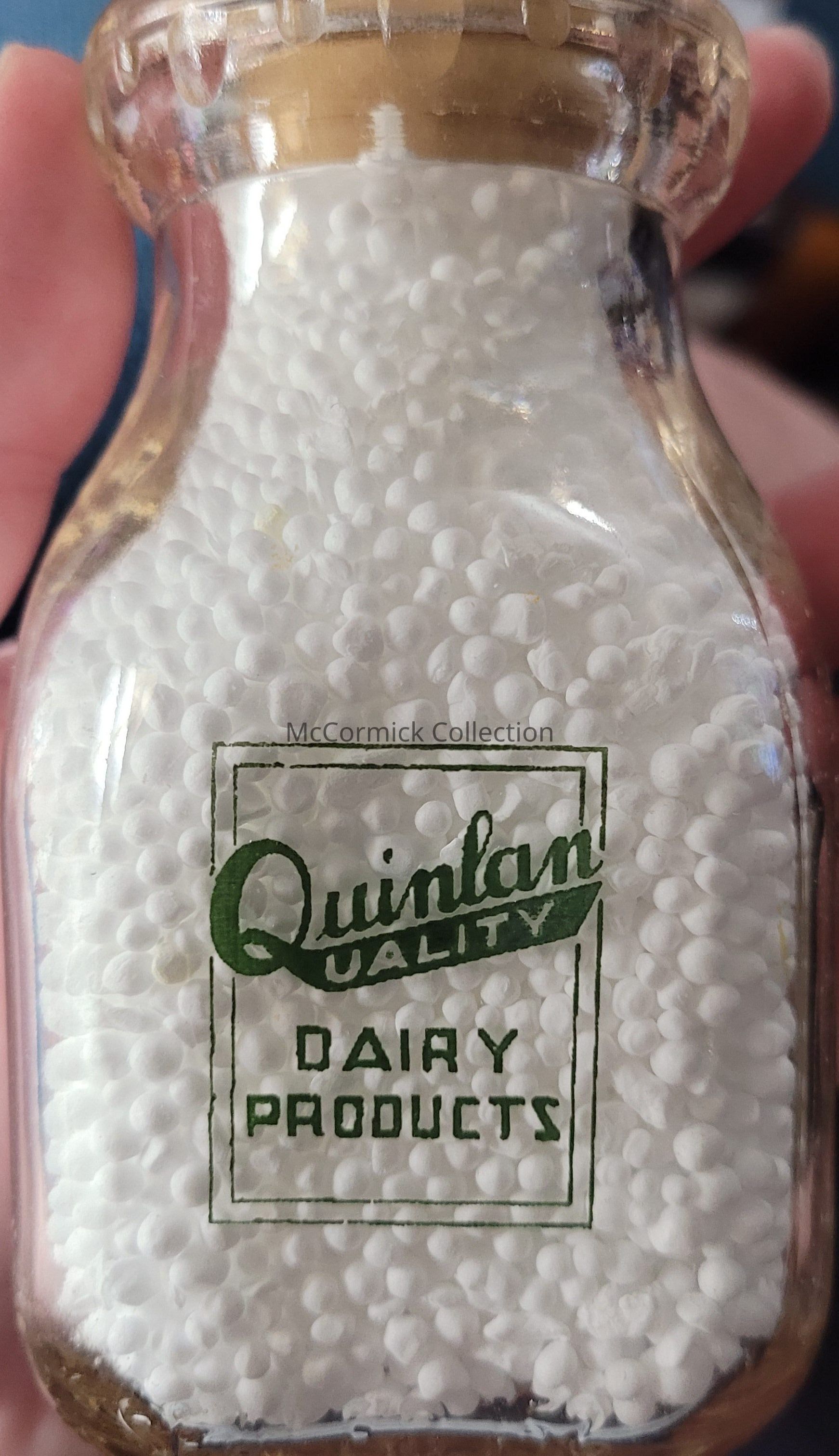 A square green pyro half pint bottle from the Quinlan Bros. Dairy of Williamston, Michigan.