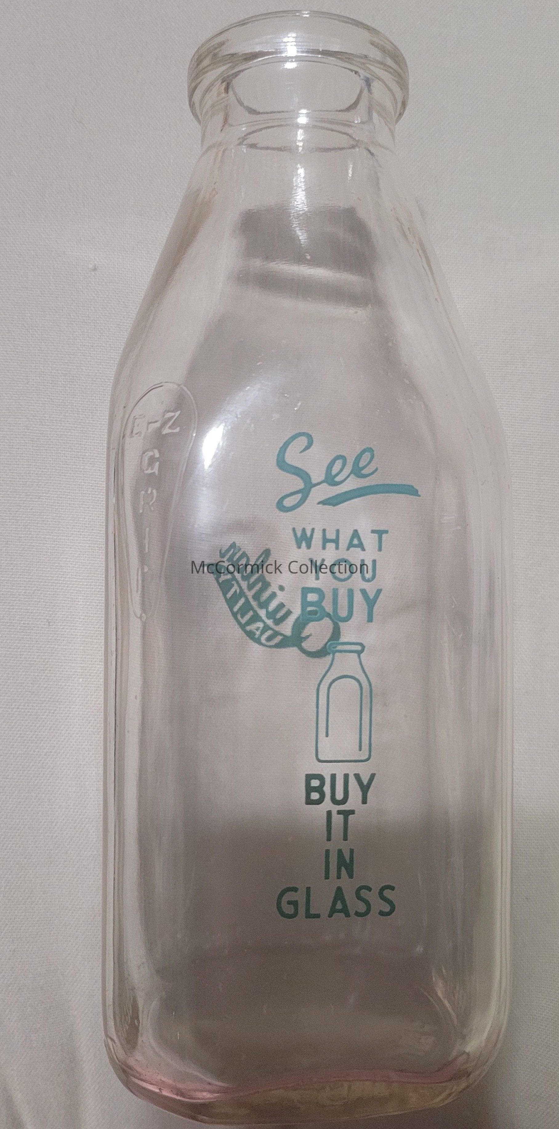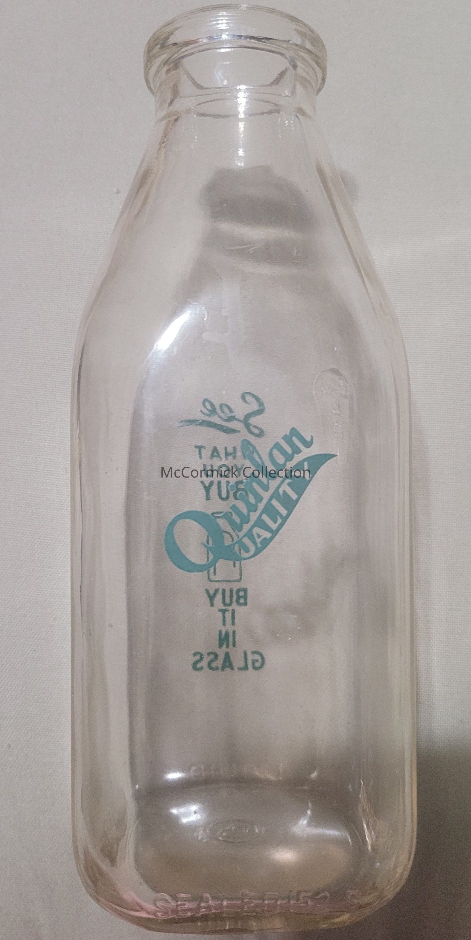 A square quart bottle with green pyro for Quinlan Bros. dairy of Williamston, Michigan. With "See what you buy / Buy it in glass" slogan.