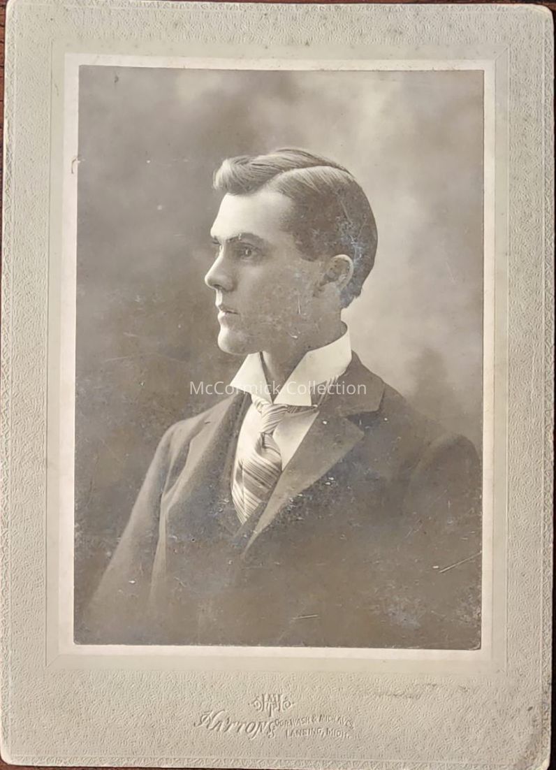 Card mounted photograph of R.E. Morrow of Central Lake, Michigan, Class of 1898 Michigan Agricultural College. Photo by Lansing photographer Hatton. From O.W. Slayton Collection.