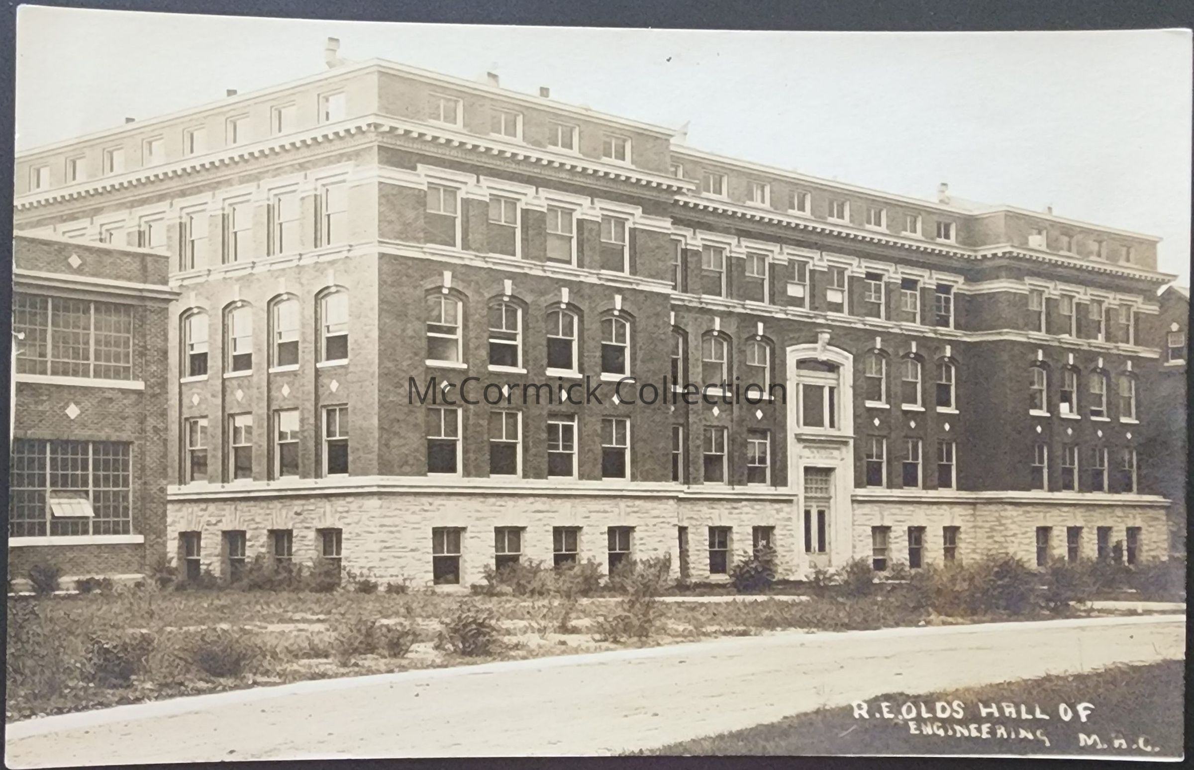 Real photo postcard of the R.E. Olds Hall of Engineering at Michigan Agricultural College in East Lansing, Michigan. Postally used.