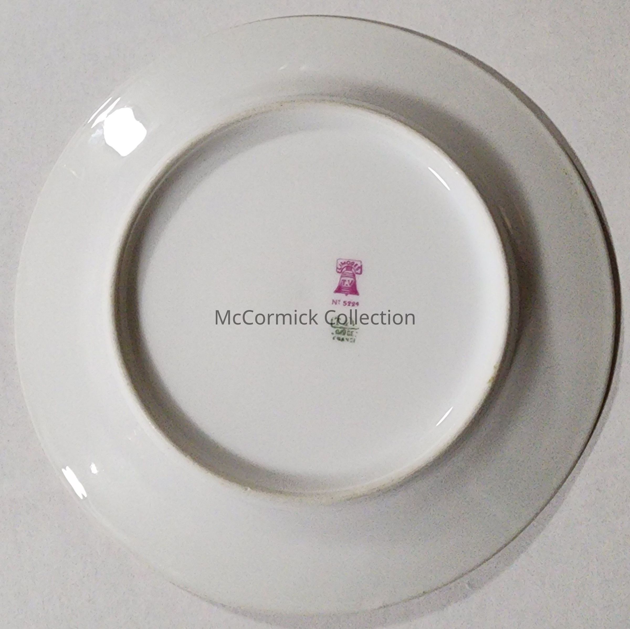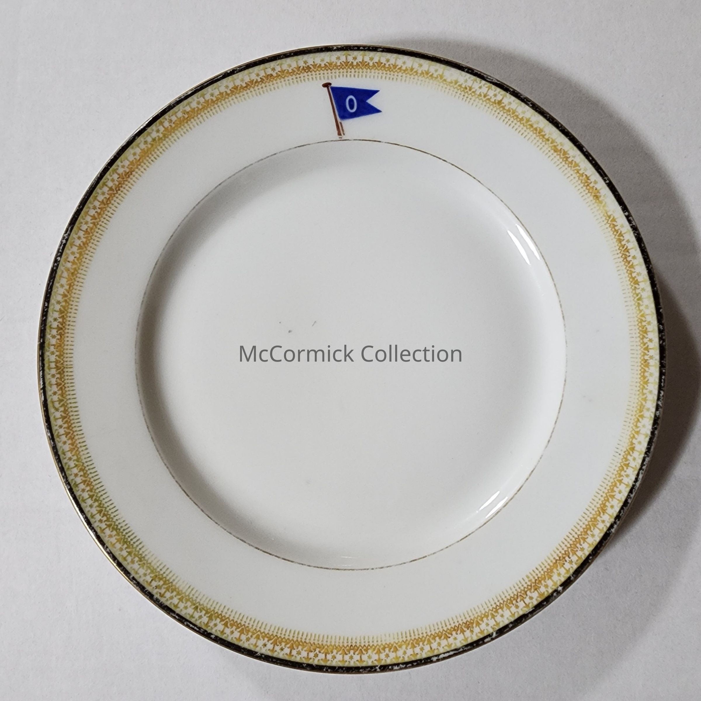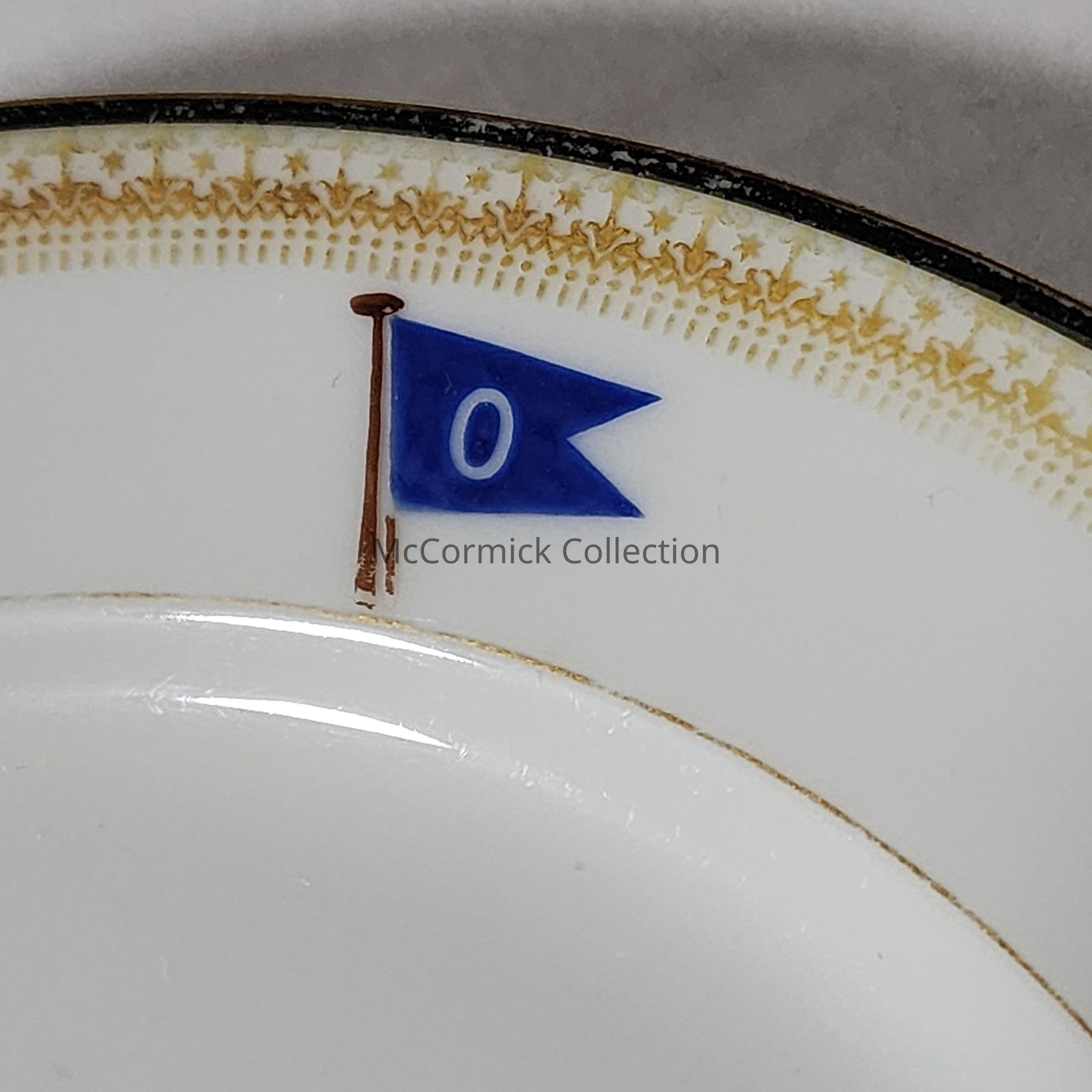 China plate made by T&V Limoges, France, custom for Ransom Eli Olds personal yacht, featuring his personal yacht logo, a blue flag with O for Olds.