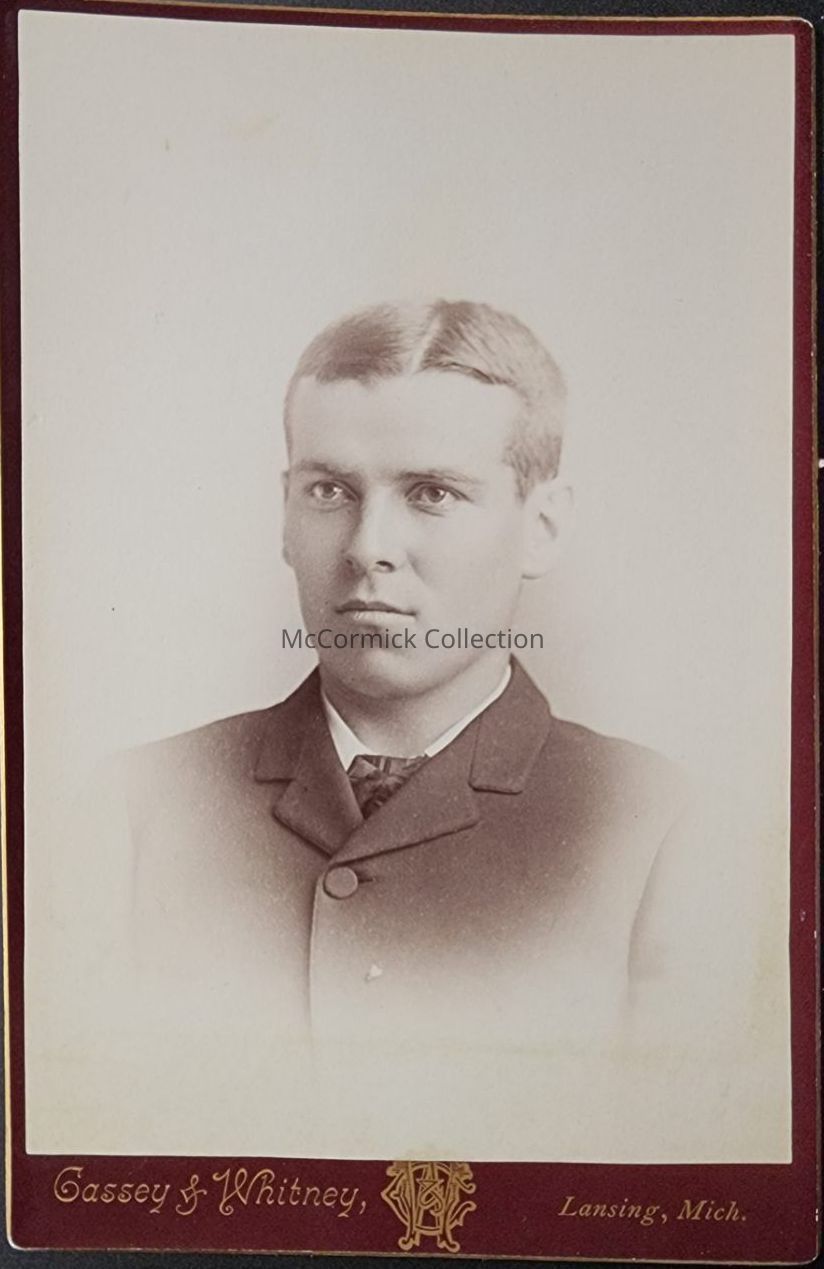 Cabinet card photograph of R.J. Coryell kf Jonesville, Michigan, by Lansing photographer Cassey and Whitney. Student at Michigan Agricultural College.