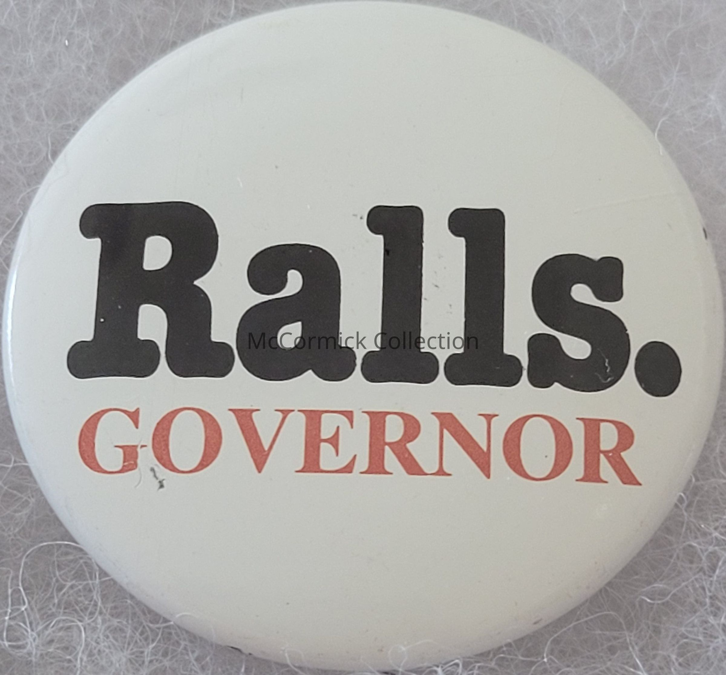 A 1.5" black, white, and red political button for William Ralls for Governor of Michigan, 1978.