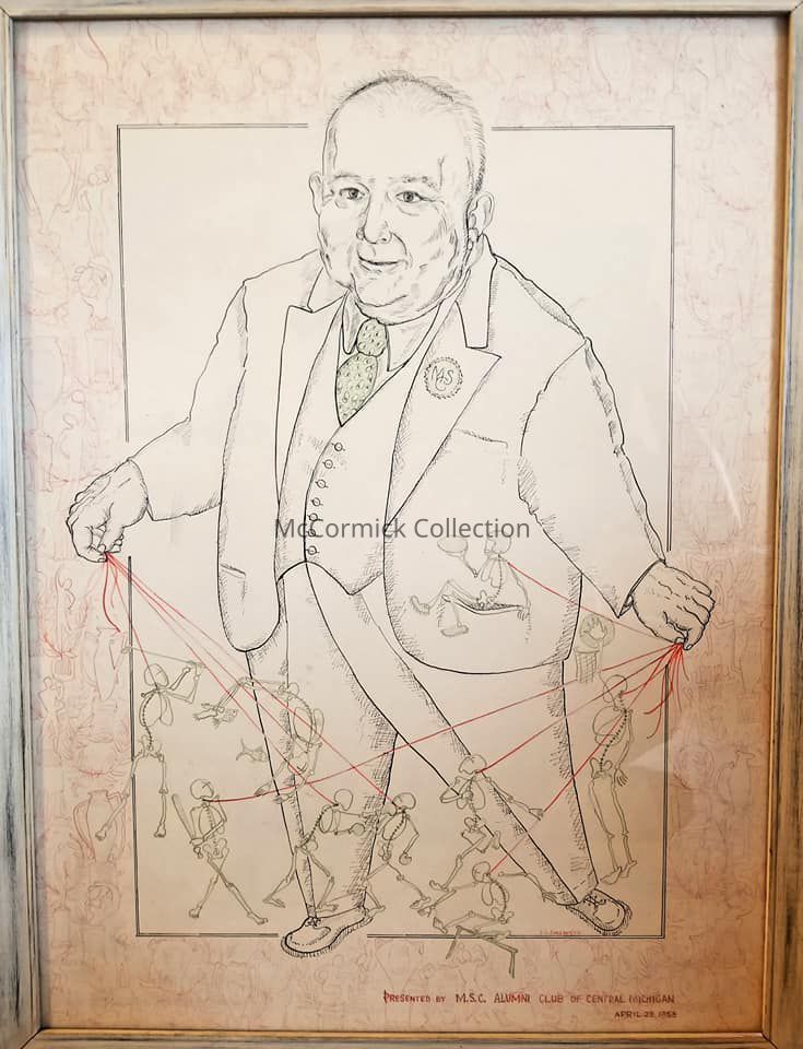 A 1953 presentation pen and ink drawing of MSC Athletic Director Ralph H. Young by Irene G. Jungwirth for Young's retirement from MSC in 1953-54. Presented by MSC Alumni Club of Central Michigan, April 28, 1953. Framed.