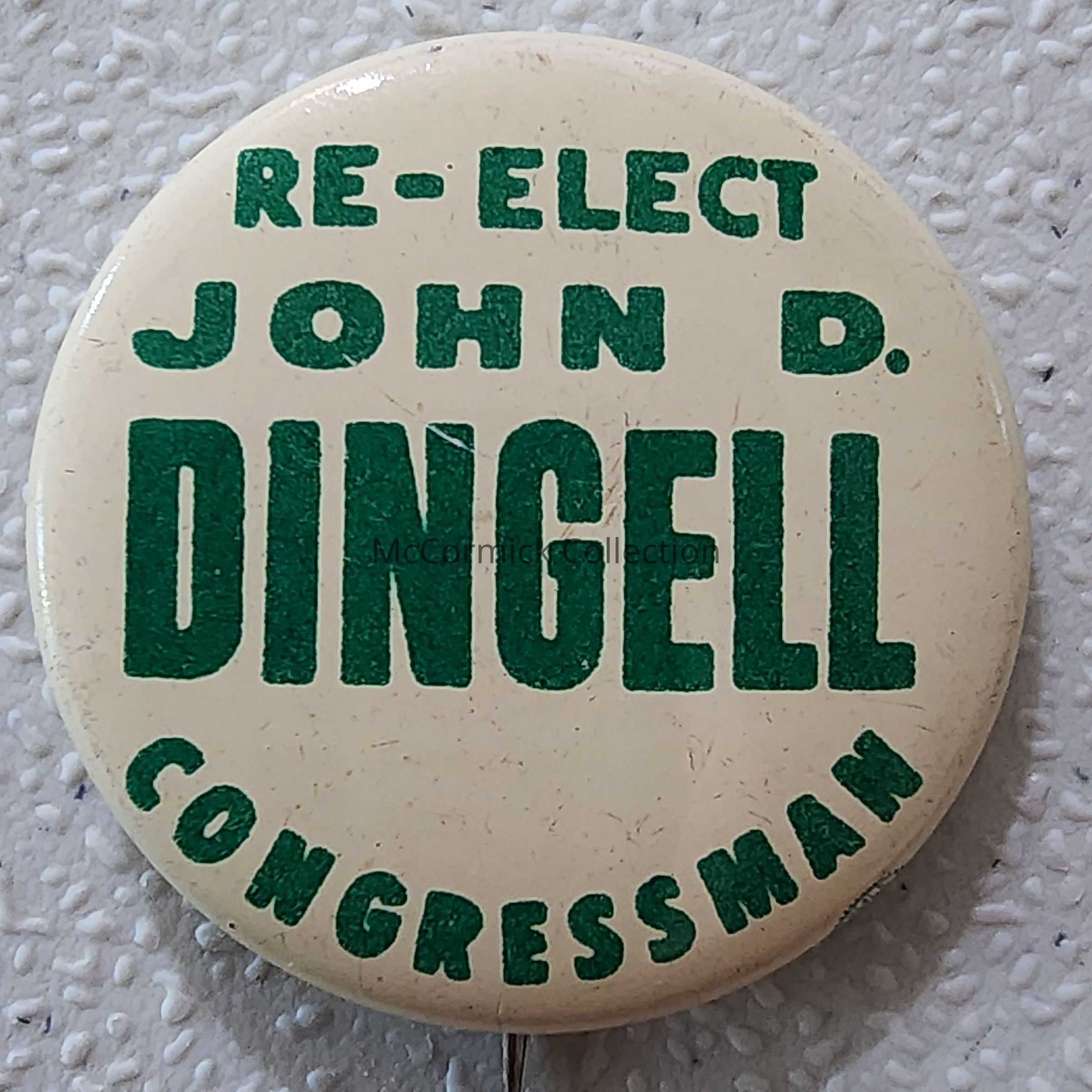 A 9/8" green and white political button for John Dingell for Congress.