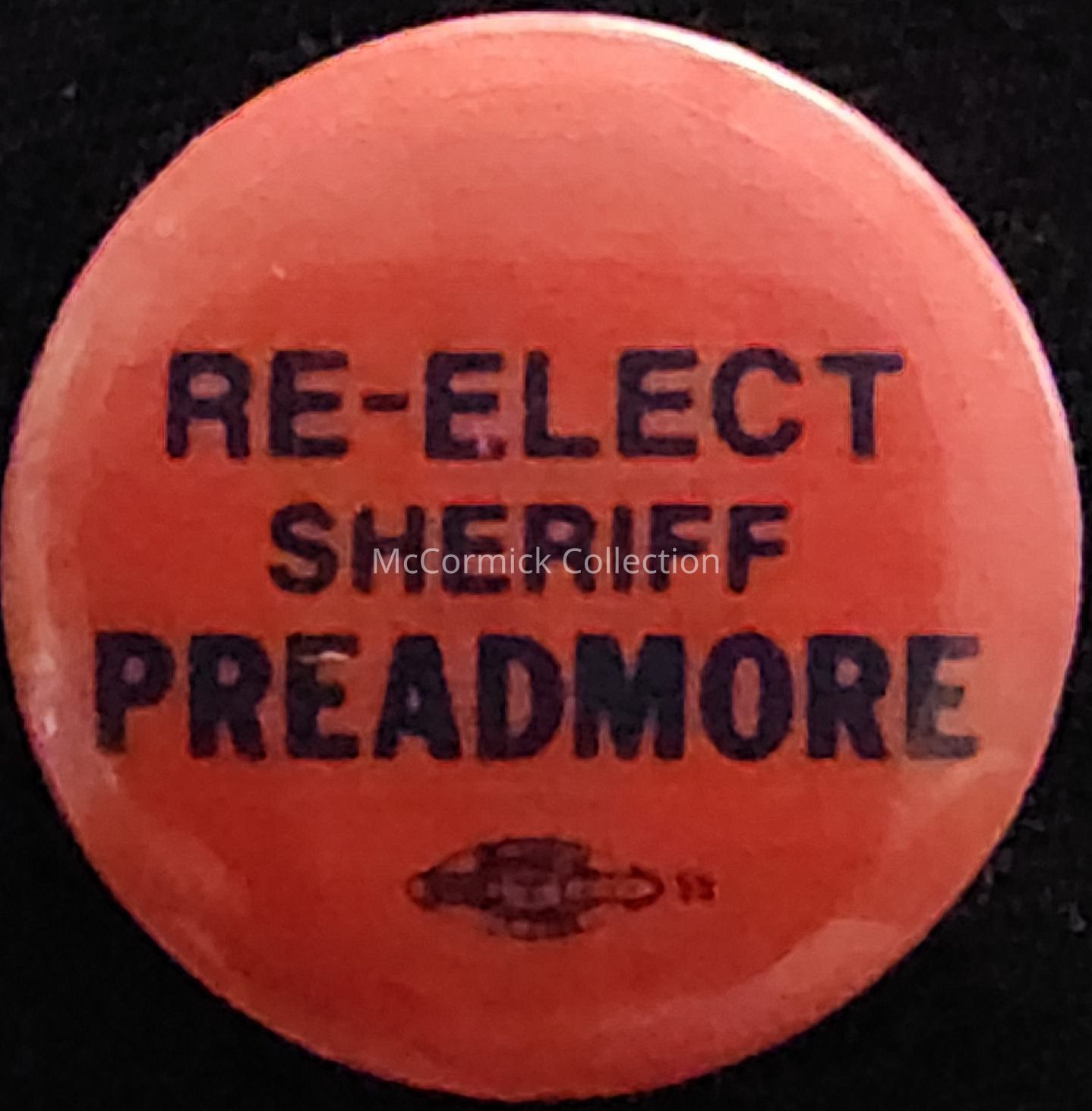A 1" red and black political button for the Reelection of Kenneth Preadmore for Ingham County Sheriff, circa 1970s.