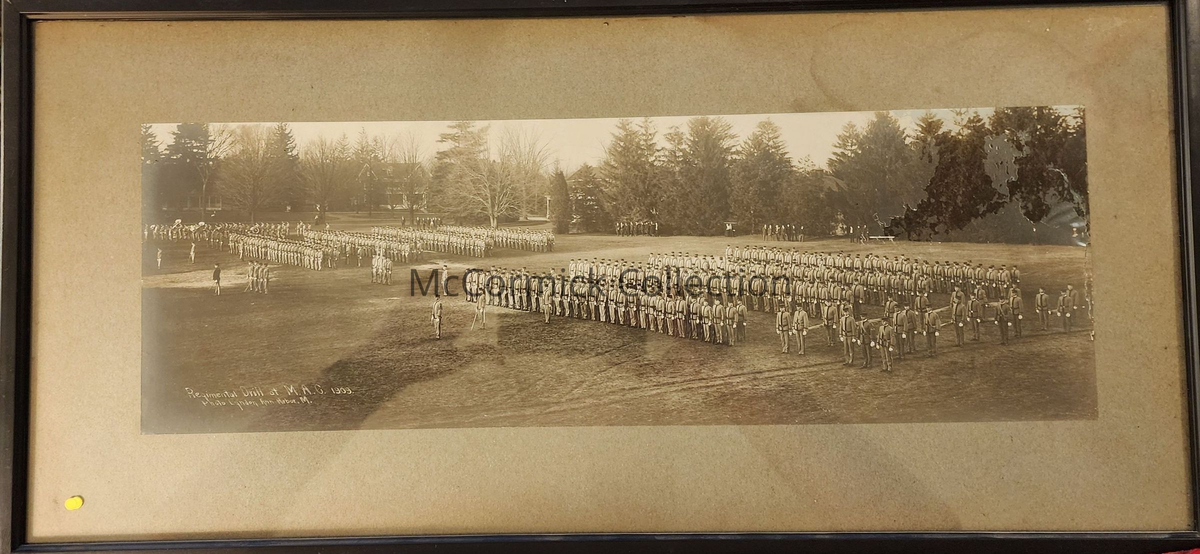 Framed panoramic photograph of the Michigan Agricultural College Regimental Drill on the graded drill field (Landon Field, Adams Field), with Faculty Row in the background. The band is pictured at the far left end in the distance. Photograph by Lyndon of Ann Arbor, 1909.