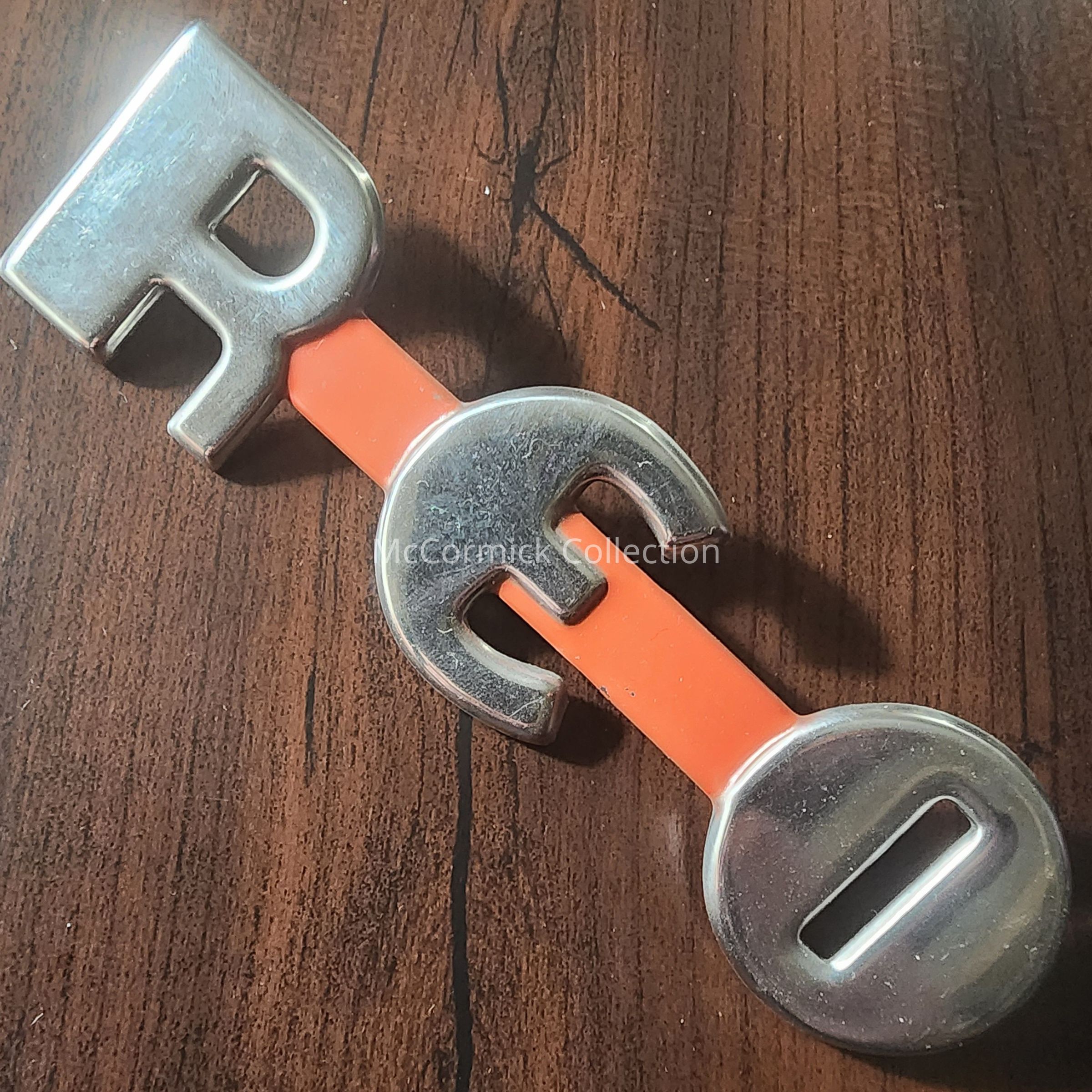 A chrome vehicle emblem from a REO, made in Lansing.