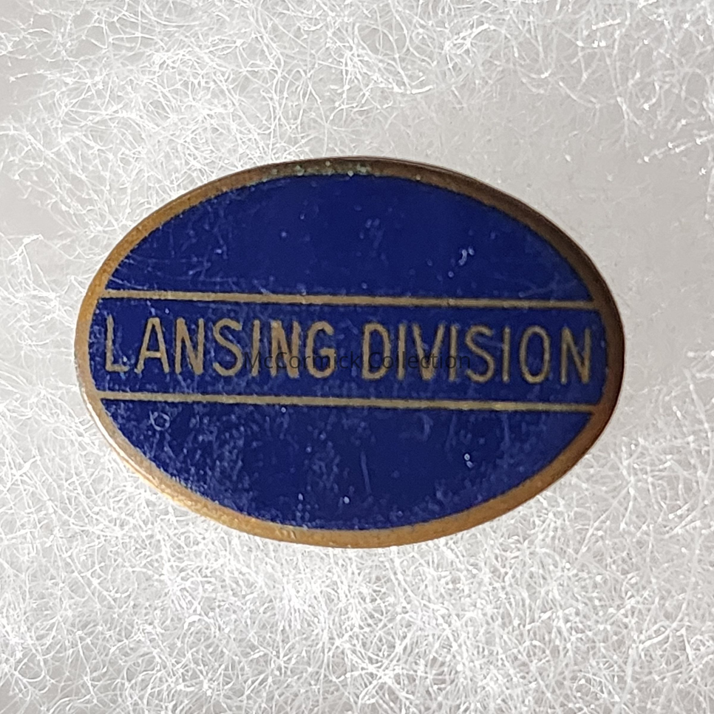 A blue and gold enamel pin reading "Lansing Division" from REO Motors.