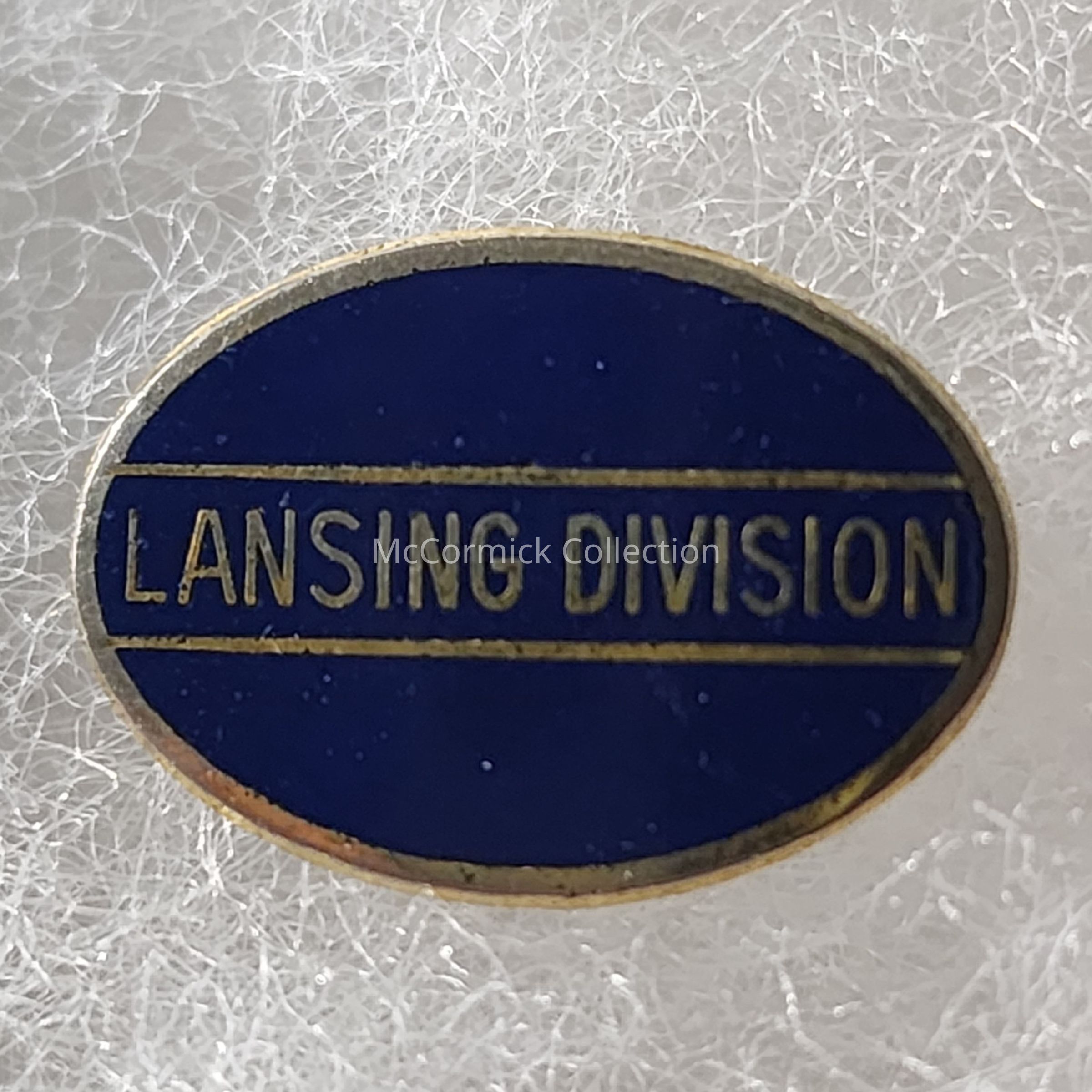A blue and gold enamel pin reading "Lansing Division" from REO Motors.