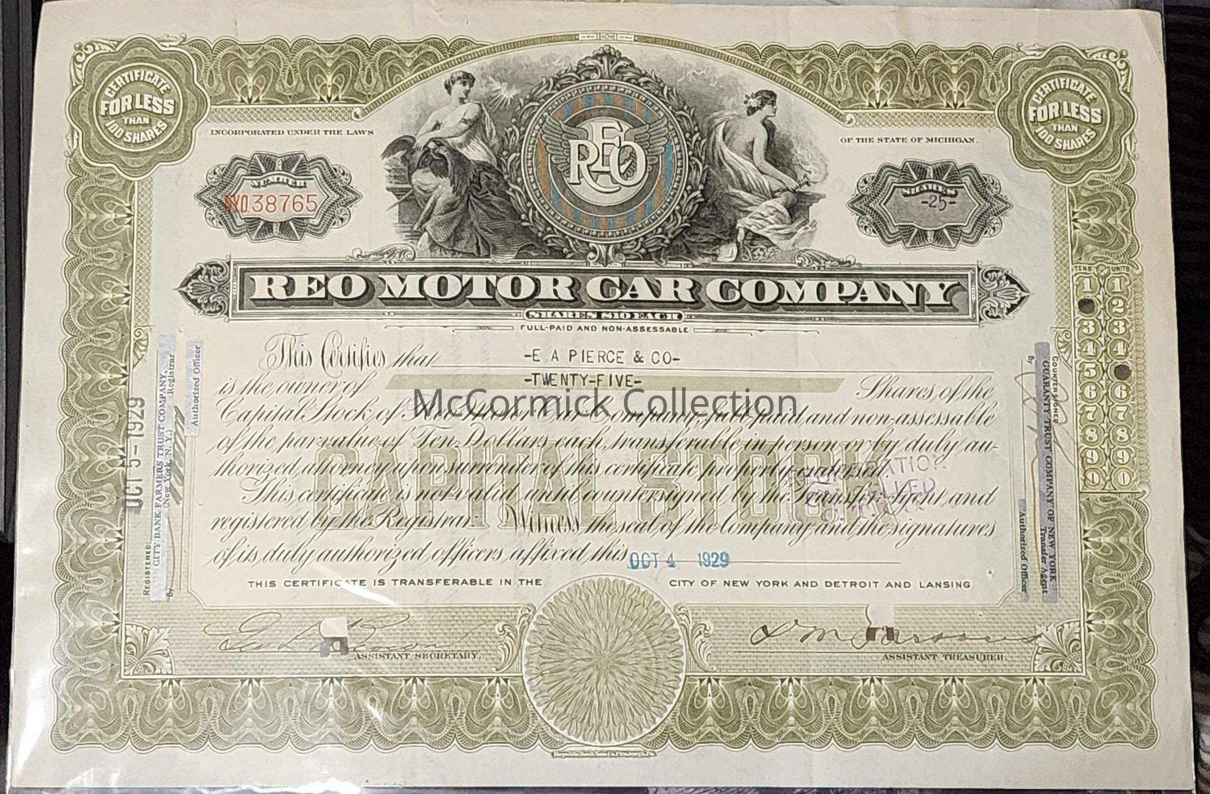 A 1929 capital stock certificate for the REO Motor Car Co., of Lansing for 25 shares of E.A. Pierce.