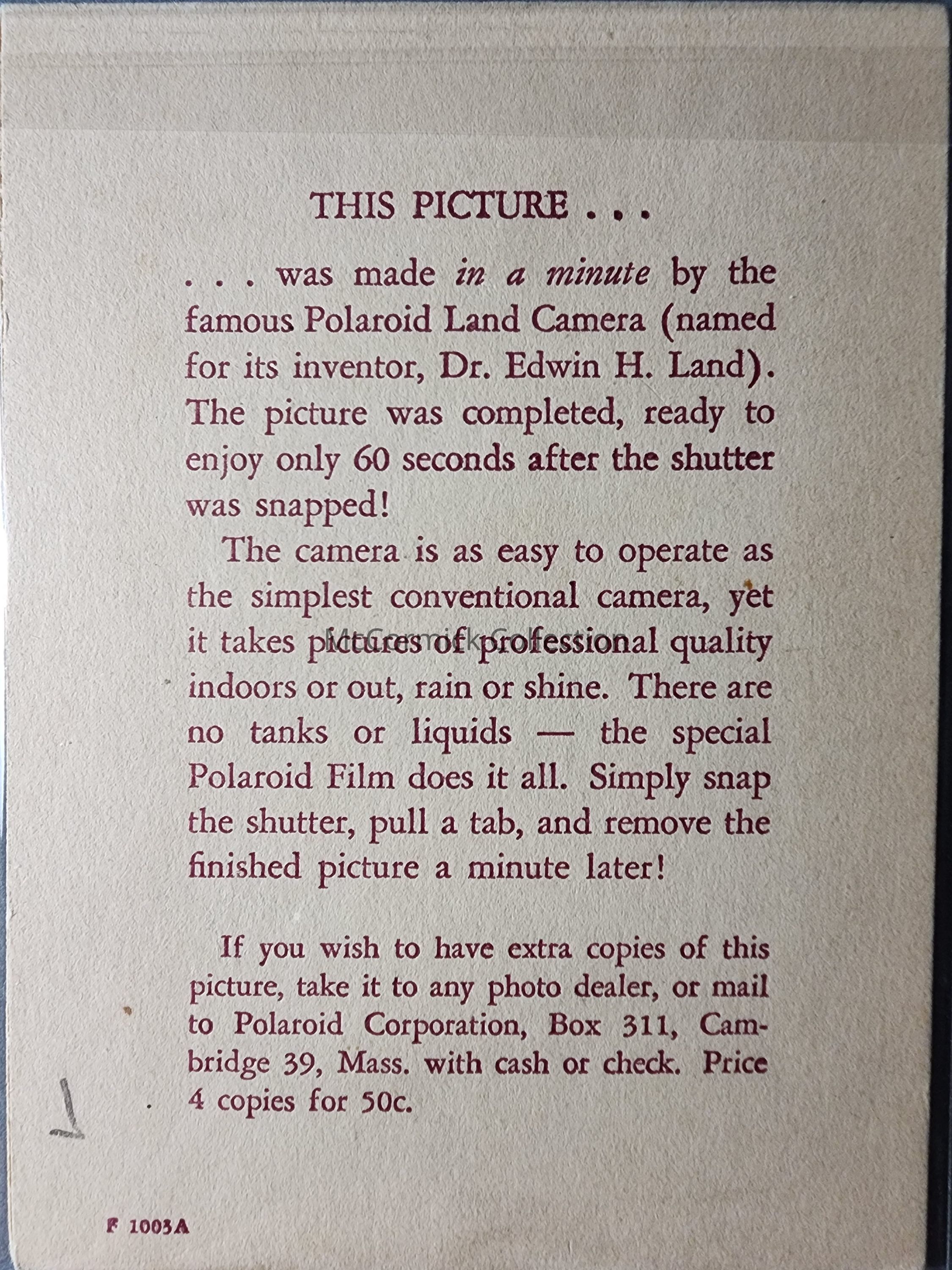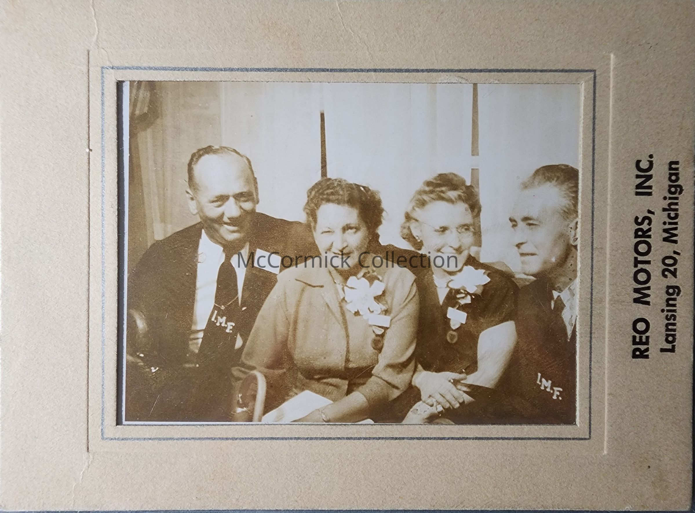 Snapshot photograph of four unidentified people at an event tied to REO Motor Car Co. in Lansing. Polaroid frame has REO advertising.