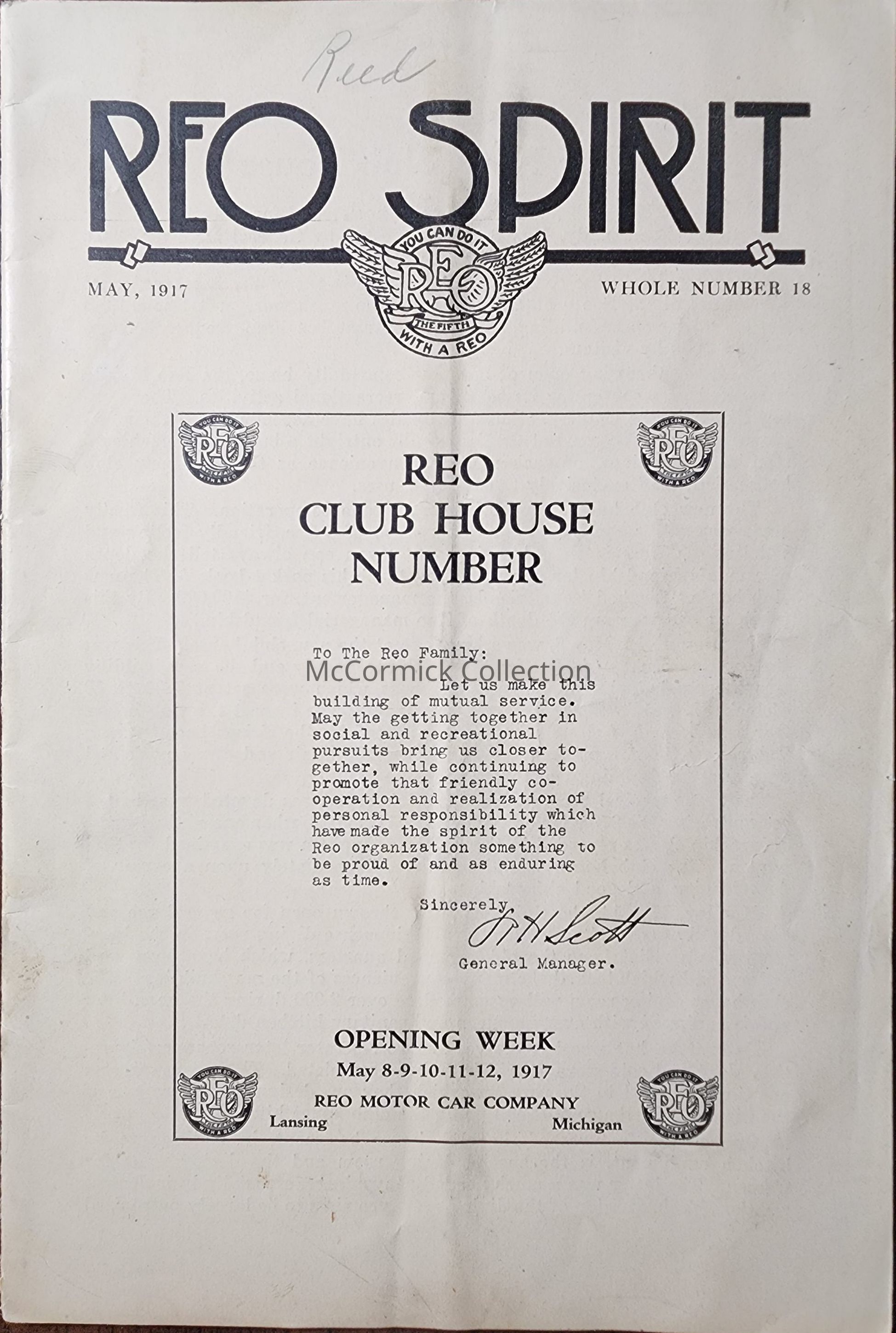 The May 1917, whole number 18, REO Spirit company newsletter. Clubhouse opening spread. From Reed collection of 11 newsletters purchased, Oct. 2023.