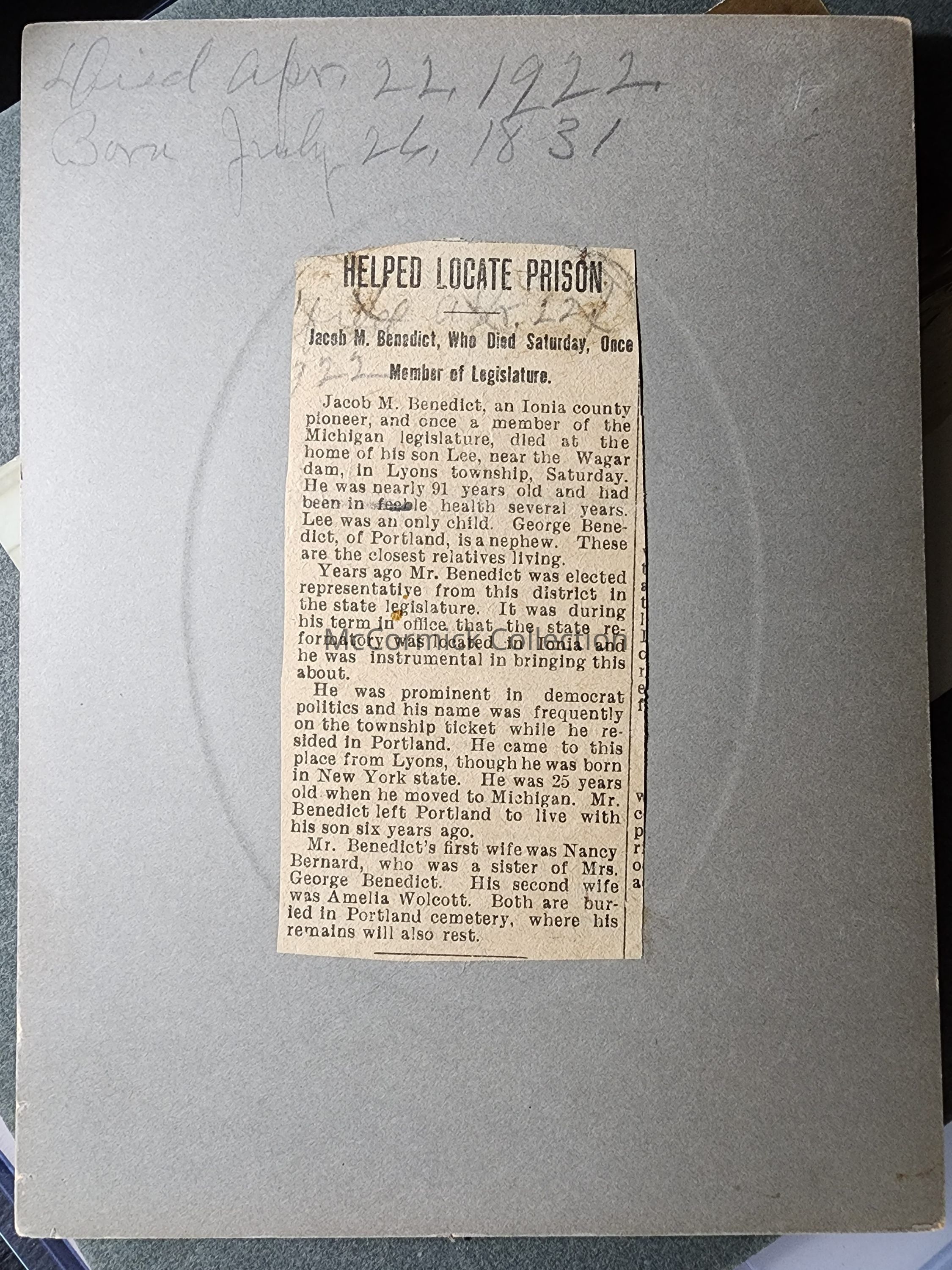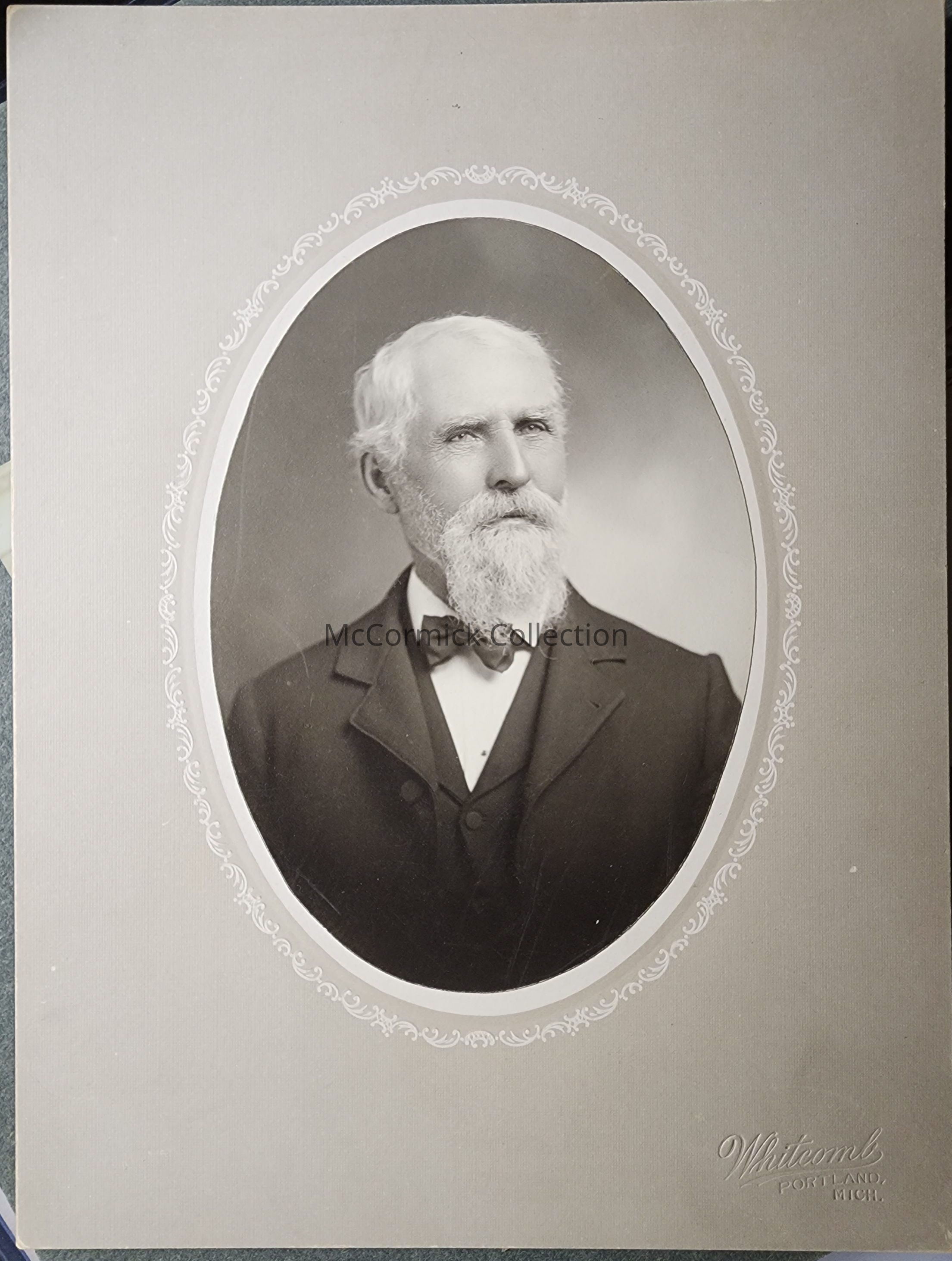 Card mounted photograph of State Representative Jacob M. Benedict of Ionia by Portland, Michigan, photographer Whitcomb.