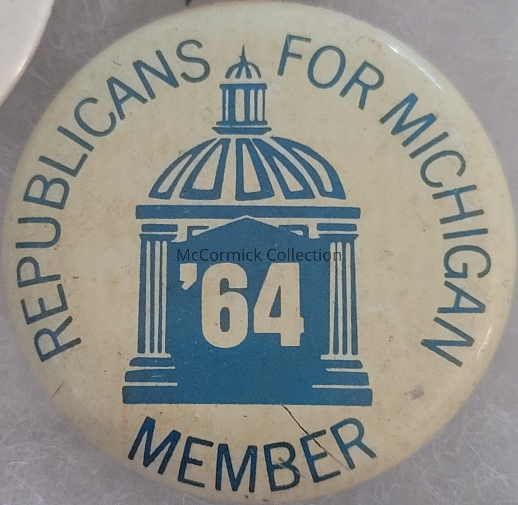 A blue and white political button for Members of Republicans for Michigan, 1964.