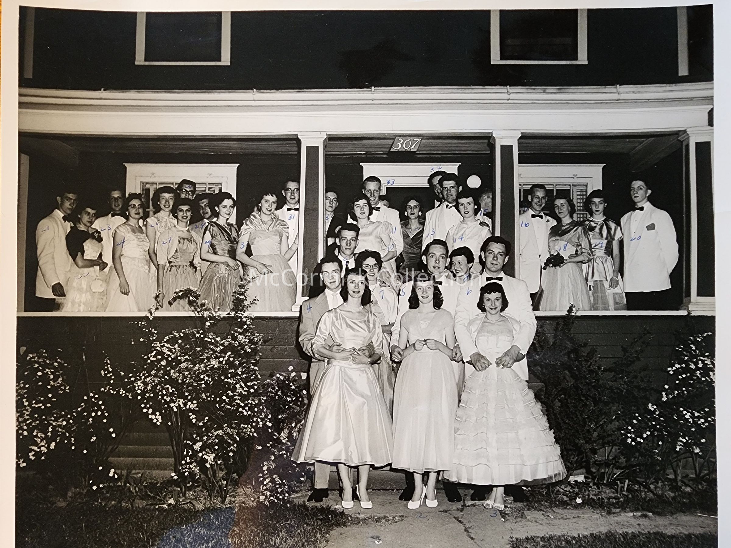 Photographic print of student dates for a dance at Resurrection catholic high school in Lansing, Michigan. Identified on back. Taken on the porch of a home with the address 307.