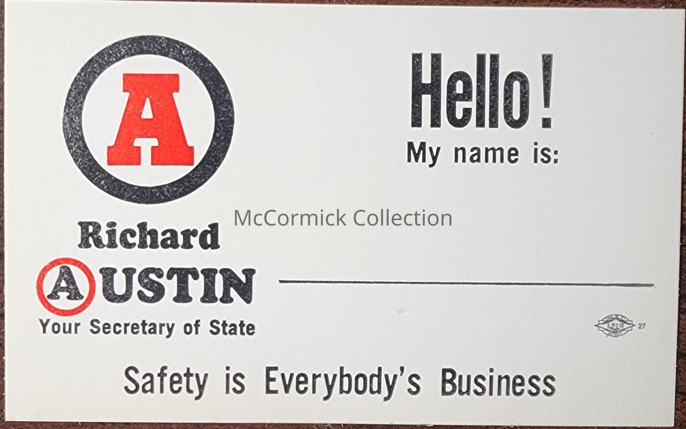 A political campaign nametag from a campaign of Richard H. Austin for Secretary of State.