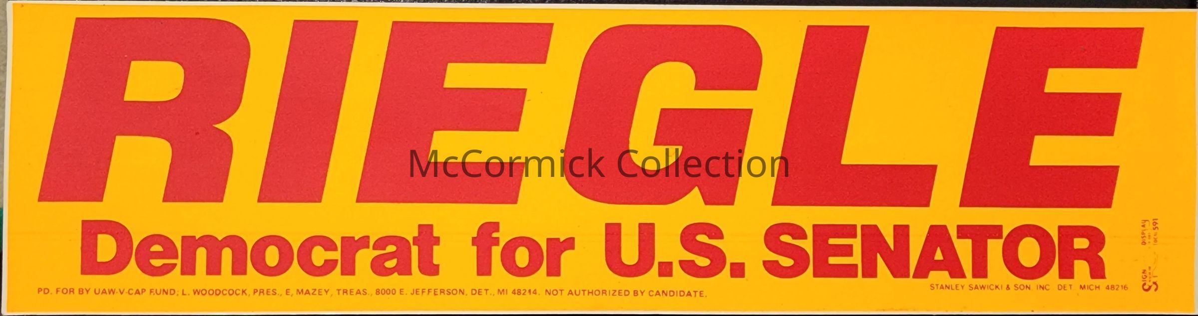 Riegle Democrat for U.S. Senator Bumper Sticker