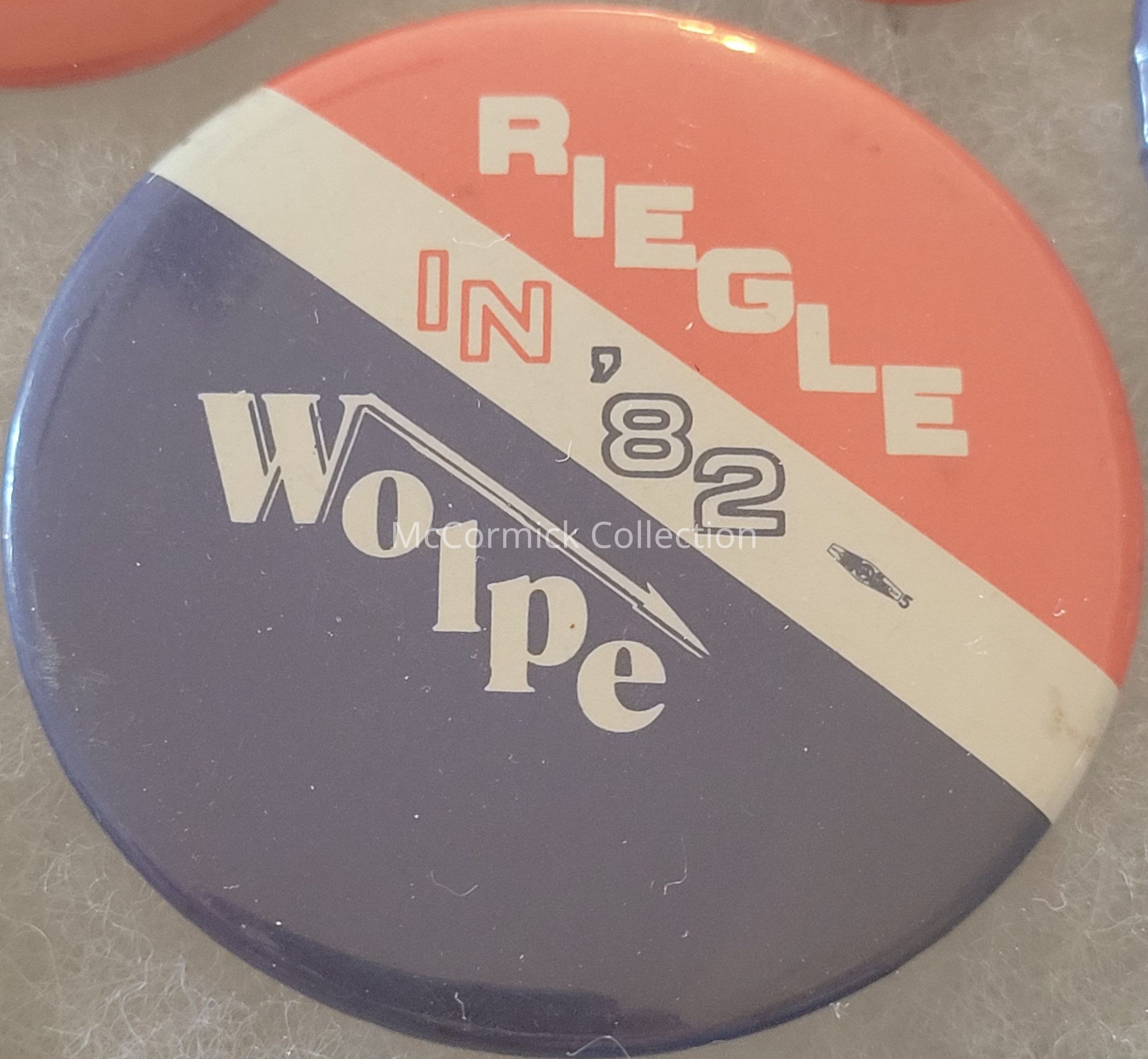 A 2.25" red, white, and blue political button for Don Riegle for U.S. Senator and Howard Wolpe for Congress, 1982.