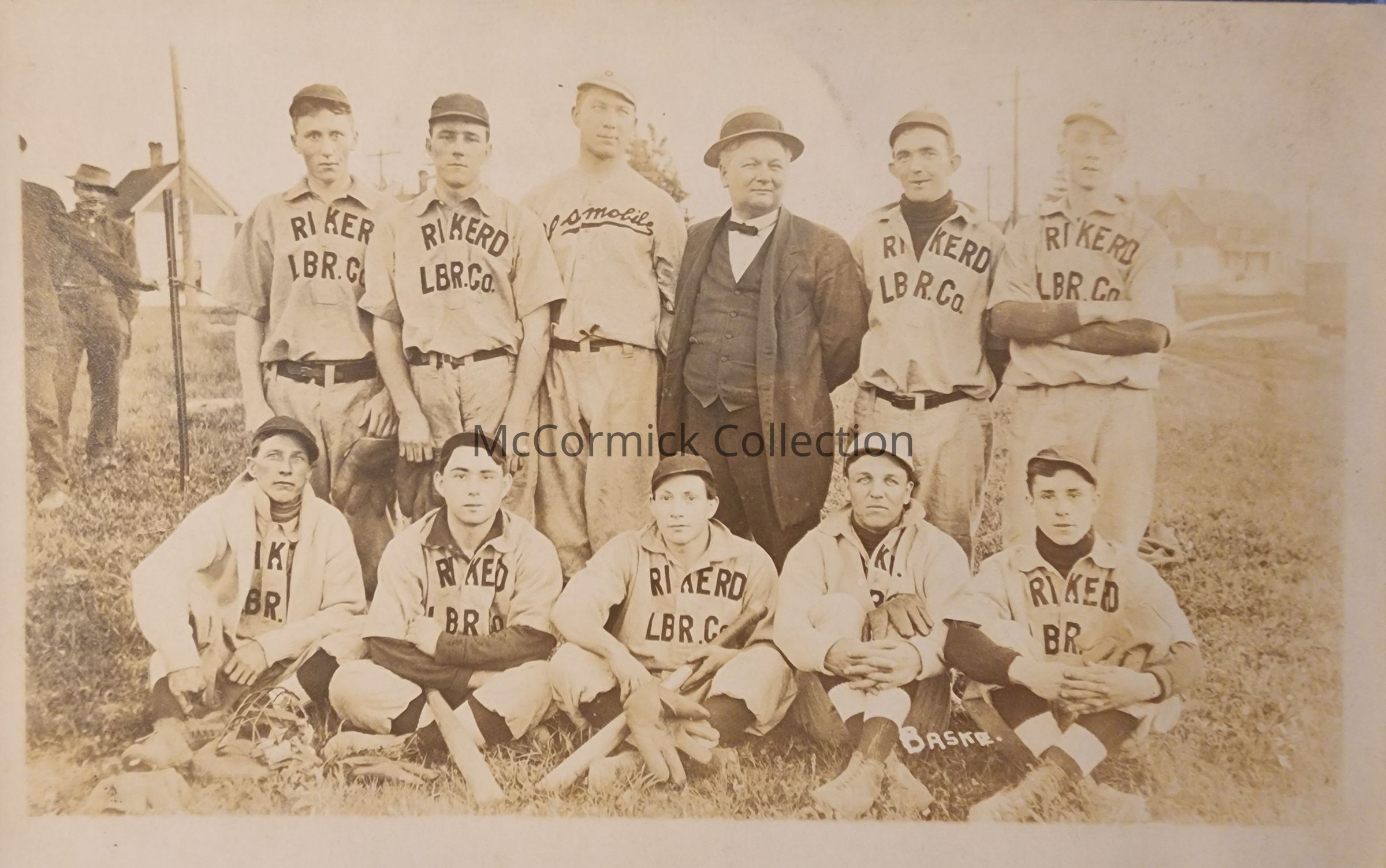 Real photo postcard of the Lansing, Michigan, Rikerd Lumber baseball team. Postally unused. Cyko stamp box. Photo by Lansing photographer Baske.