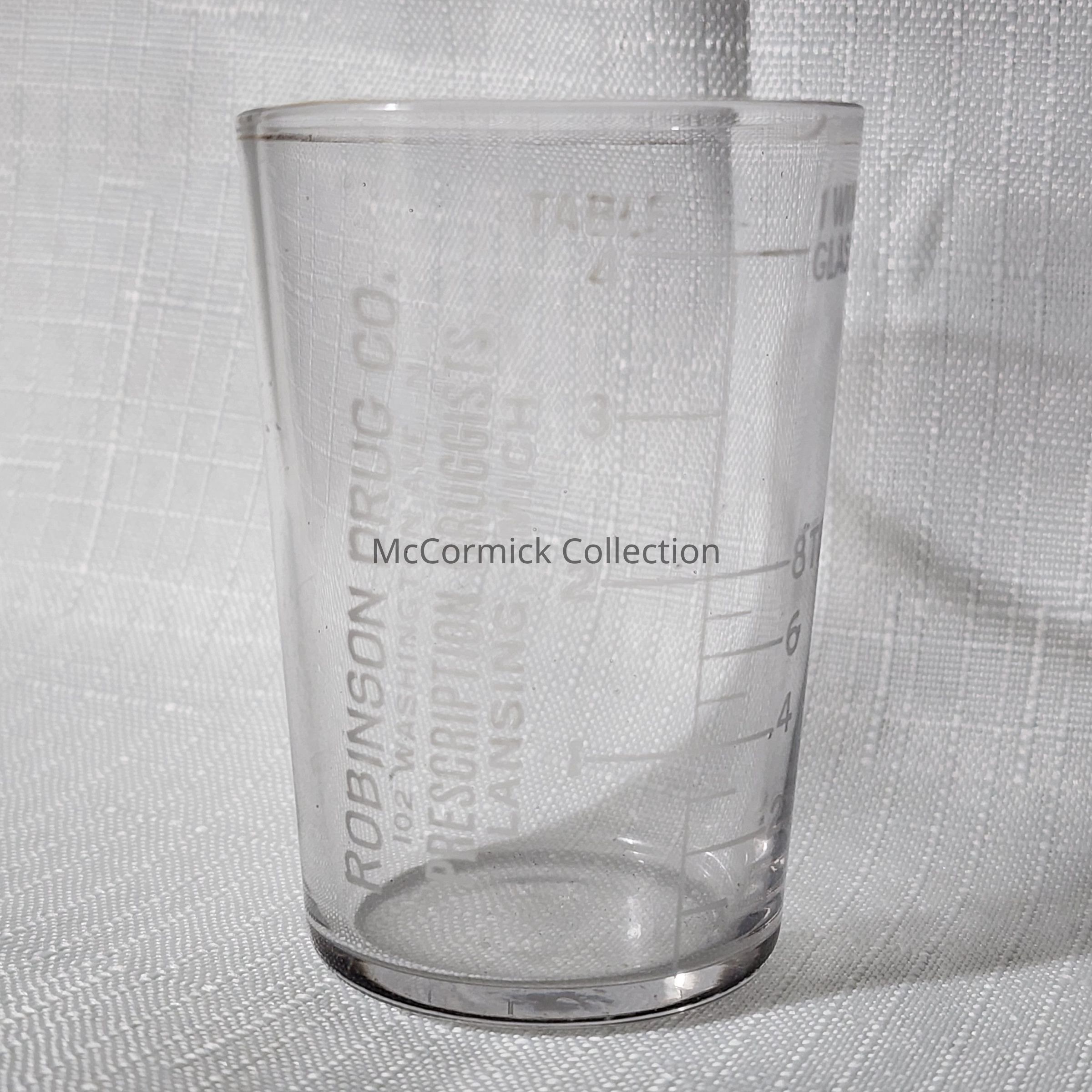 Small glass measuring cup with advertising for Robinson Drug Co. of Lansing.