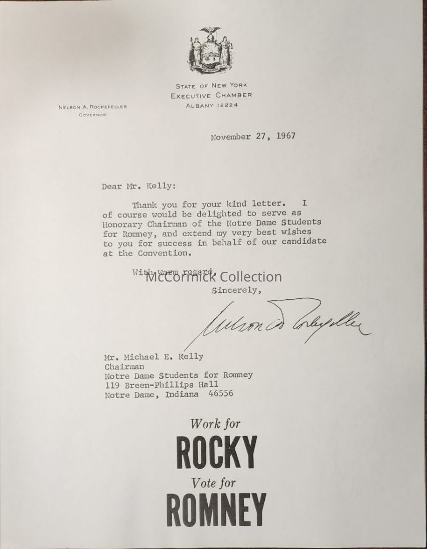 A copy letter from Nelson Rockefeller supporting Notre Dame students organizing for George Romney for President, 1967.