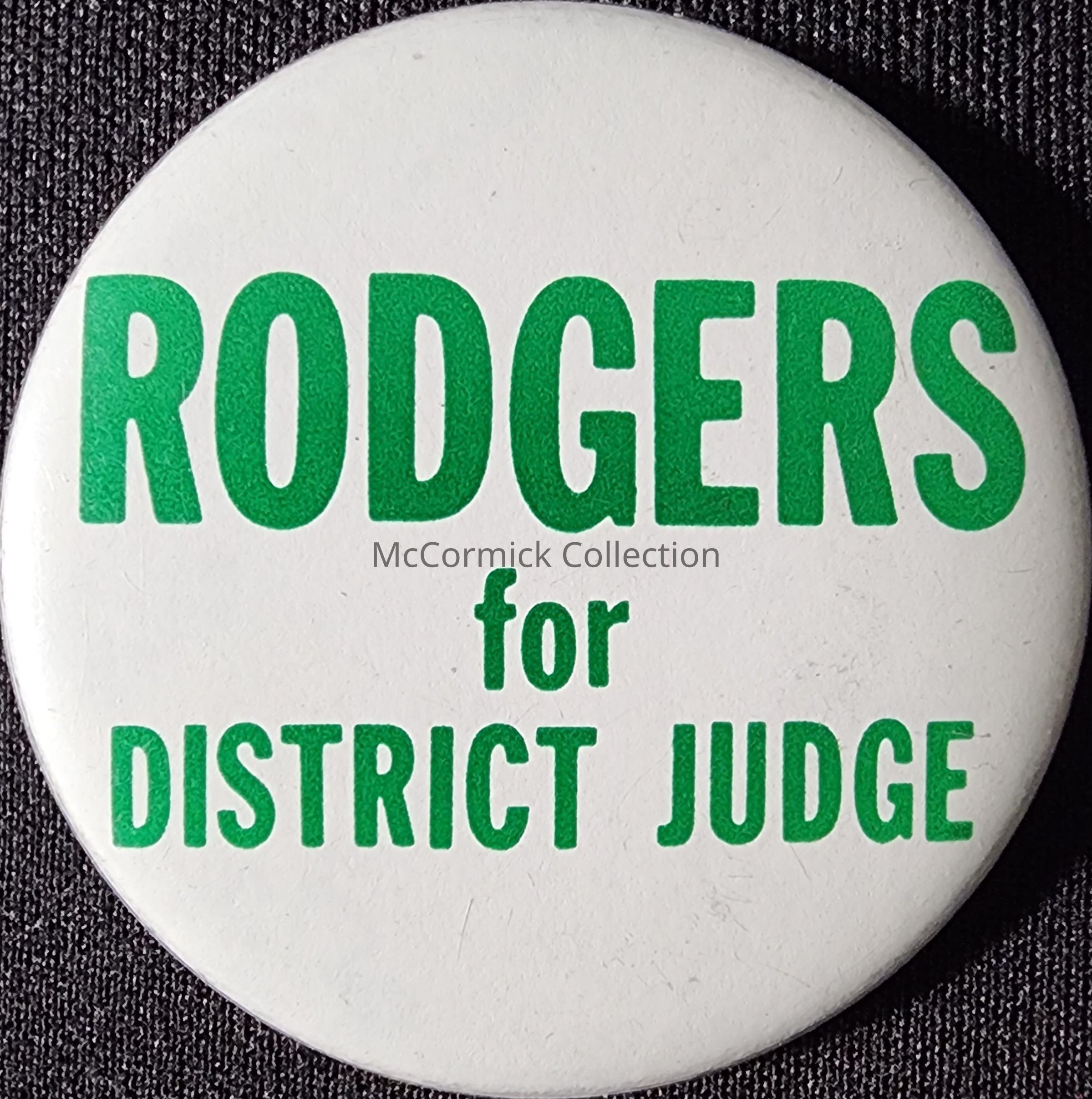A 1 3/4" green and white political button for Rogers for District Judge.